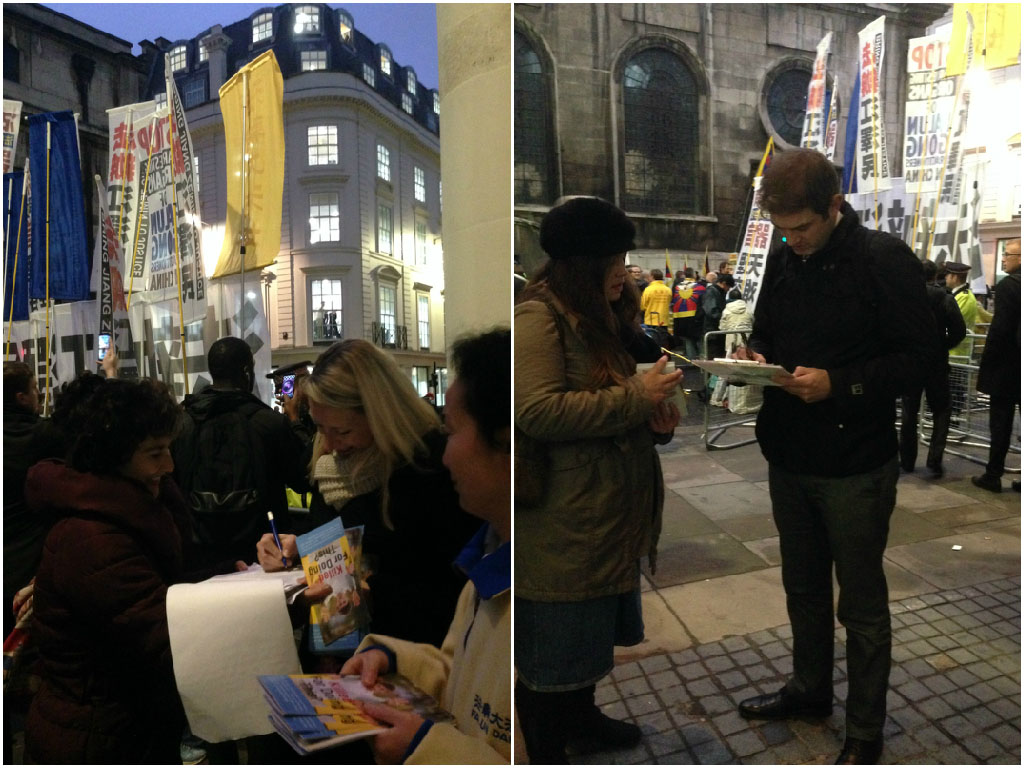 当天法轮功学员的活动赶上了金融城人士的下班高峰时间。街道上,银行家们通常匆匆忙忙的脚步放慢下来,法轮功学员便主动上前发传单、讲真相、征签。真相条幅上的信息引发兴趣和思考,活摘器官法轮功真相令听者震惊,人们纷纷掏出手机拍照,能够停下脚步听法轮功学员讲真相的人多数立即签名反对活摘器官罪恶。冲着习近平出席宴会新闻而来的媒体记者当中有人把镜头对向了法轮功的中英文真相条幅。