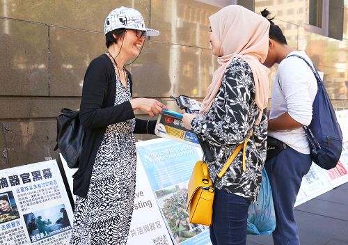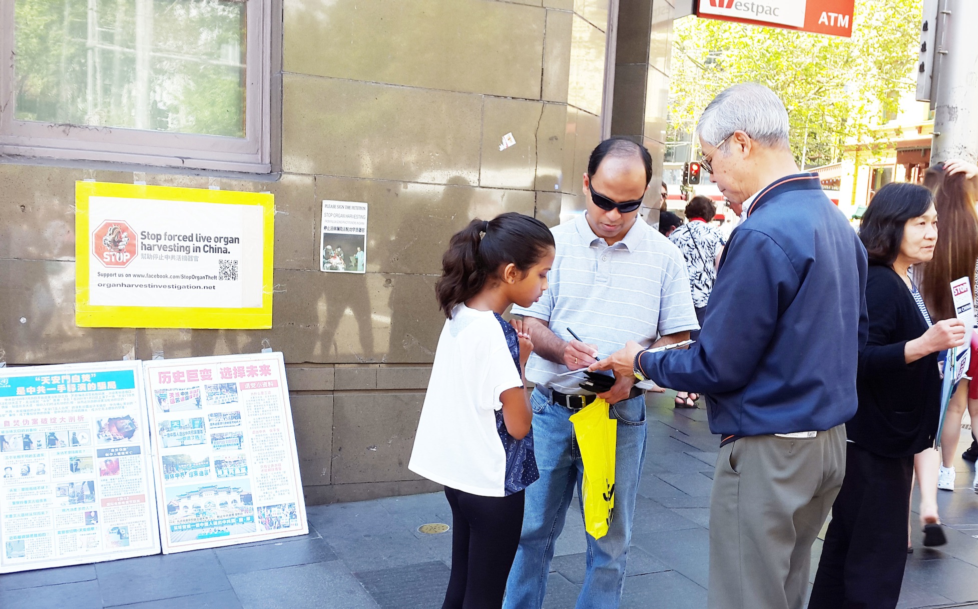 一位名叫安东尼(Anthony)的西人男士在中国城的法轮功真相摊前停下来,认真听法轮功学员关于中共活体摘取法轮功学员器官的陈述。他接下了几份真相资料,并在制止“活摘”征签表上签了名。他告诉法轮功学员,他在网上了解到一定的有关“活摘”的信息,并表示这是不能接受的事。他说,用请愿书签名的方式,呼吁澳洲政府向中国政府提出人权问题是一种可行的方法。并表示,如果政府因经济利益而无视人权问题是不对的。