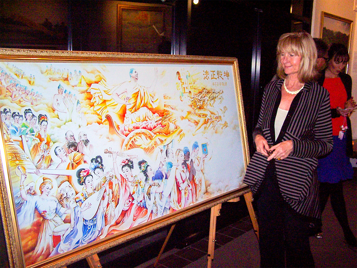 画家赖恩斯女士(Linda Lyons)以前对法轮功了解甚微,以为他们不过是一群中国政府想控制的示威者。但美展彻底改变了她的观念。她感慨地说:“我在作品中看到了佛的形象,然后又看到那个年轻人被活摘肾脏。我震惊了,眼泪夺眶而出,这些画面深深地触动了我的心灵。”“法轮功的五套功法也使我入迷。我要去学炼法轮功,我太想学了。下周日我一定去。我很庆幸今天来到这里。”