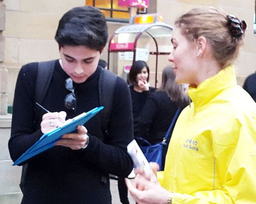 从英国来澳洲旅游的帕姆、黎安倪和朋友(Pam Poche 、Leanne Roche)看到“活摘”消息非常震惊,她们你一句我一句的表示:人们应该有选择的权利并在同意的情况下摘取器官捐助,并不是这么邪恶的行为被动“活摘”,这是非法和非常不好的行为,应该被尽快制止。她们一一在声援中国民众控告迫害法轮功的元凶江泽民和制止中共活摘法轮功学员器官的征签表上签了名后,还多拿了几份真相传单带回英国给亲朋好友去看,并建议去脸书上传播这个信息,让更多的朋友去签名尽快制止迫害。