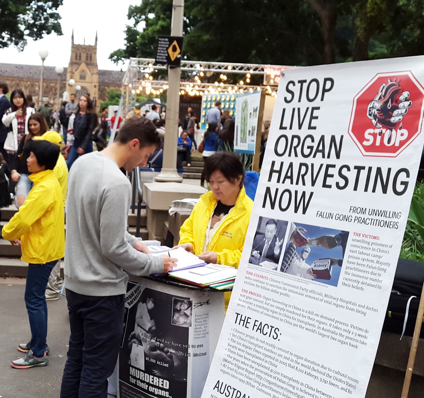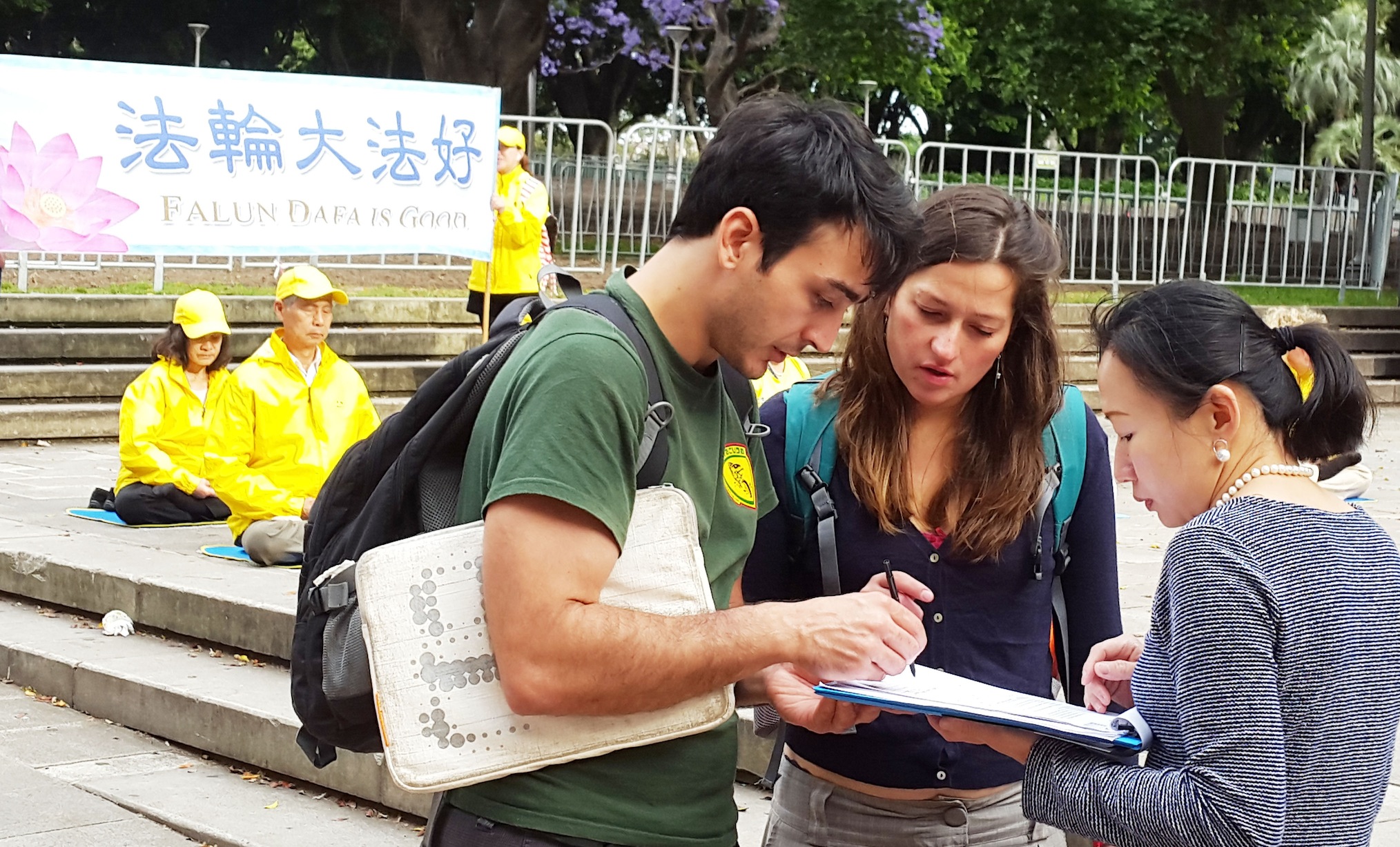 ![]() 图1-4:了解真相的悉尼人正在“制止中共活摘法轮功学员器官和声援中国民众控告迫害法轮功的元凶江泽民的签名表”上签名。 |
