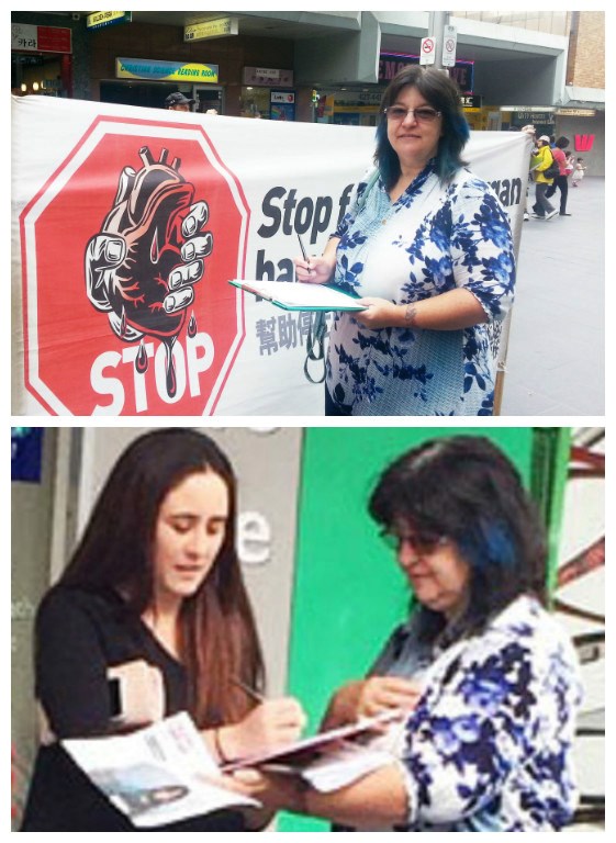 ![]() 图1:皮尔森女士(Sheree Pearson)正在请悉尼市民签名制止“活摘” |