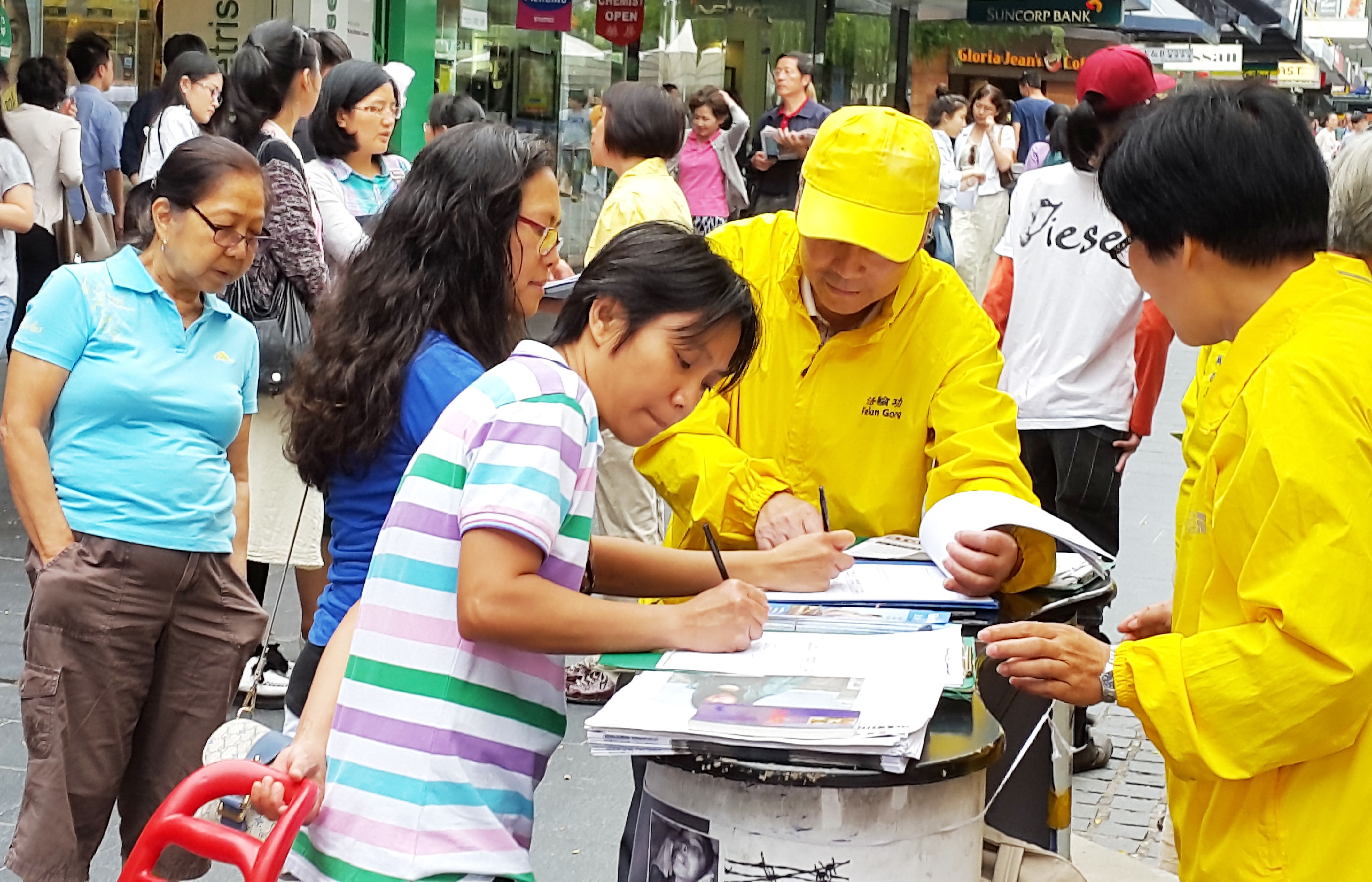 这一幕发生在二零一五年十一月二十一日中午,法轮功学员在澳洲悉尼北岸繁华富有区车士活(Chatswood)市中心的维多利亚步行街和澳洲最大连锁商场韦斯特菲尔德(Westfield Chatswood)前举办声援中国法轮功学员控告迫害法轮功的元凶江泽民和制止中共活摘法轮功学员器官罪行的活动刚刚开始之时。皮尔森女士正好回家为住在医院重病房的亲人取物,途经这里,她不仅停住脚步,在制止中共活摘法轮功学员器官的征签表上签名,还拿着征签表,象法轮功学员那样,告诉其他路人法轮功被迫害的真相并请他们签名支持。