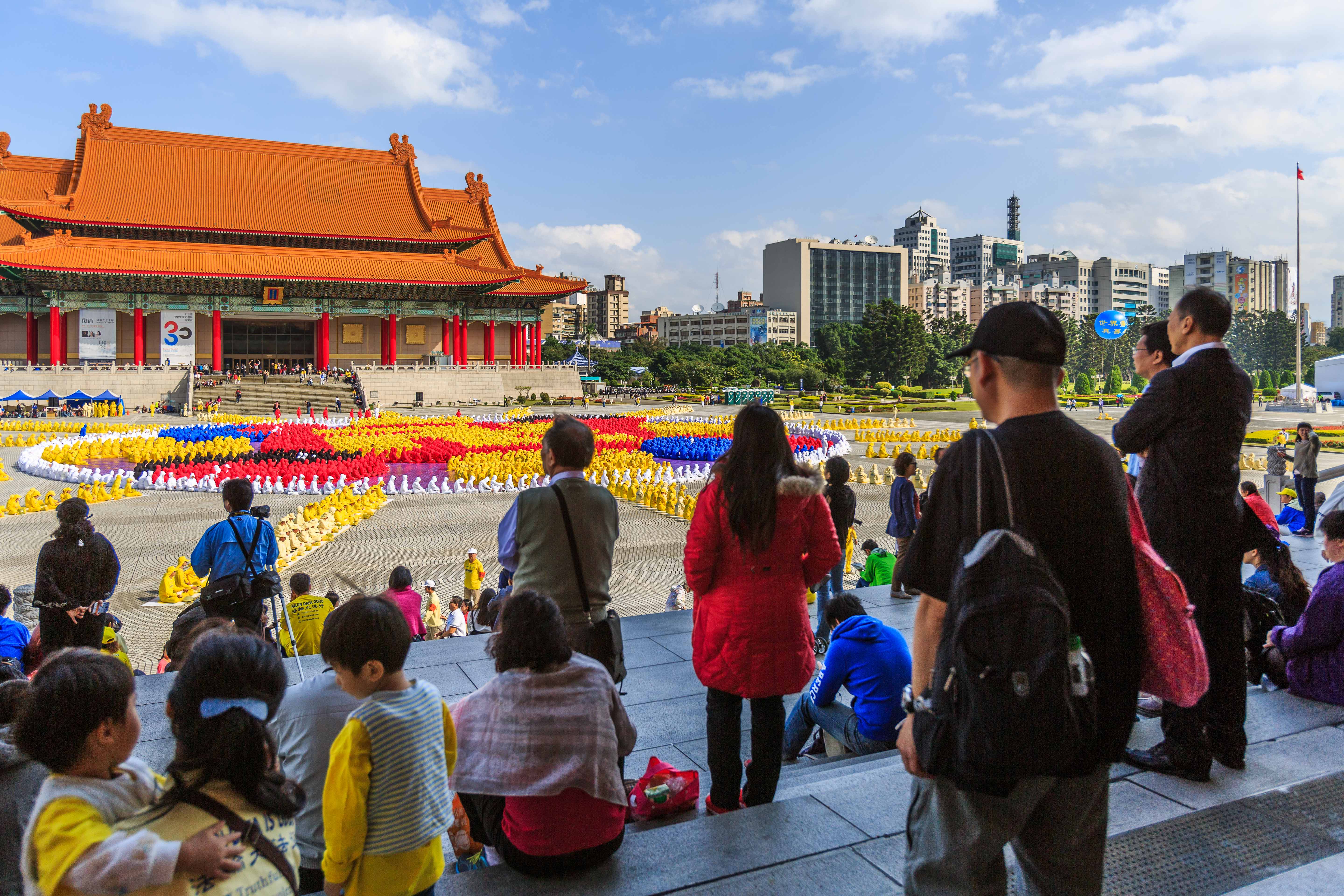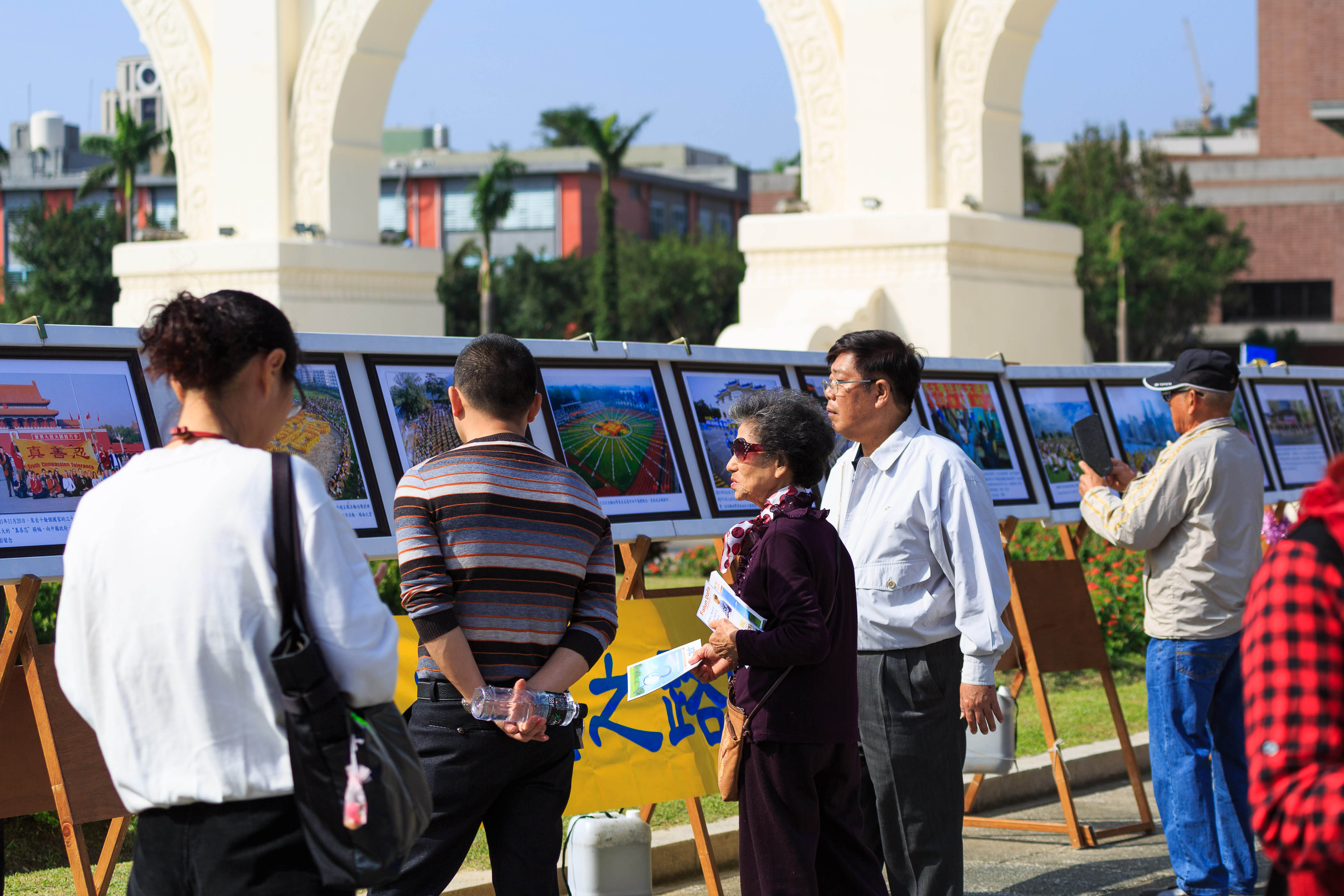 在台湾连续几天的阴雨与冷气团之后,取而代之的是温暖明亮的太阳与蓝天。排字的法轮功学员从五岁到七十几岁都有,祥和庄严的氛围,感染着周边的人潮与游客。在自由广场牌楼两侧有法轮功真相图片展和正法之路图片展,经过的游客收下大法真相资料后停下脚步睁大眼睛看着,更有很多大陆游客拿着相机与手机不停拍照,还有的游客想学法轮功。