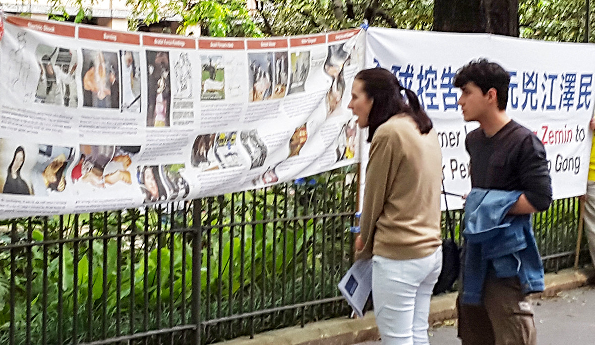 ![]() 图5:威廉(William Doclins)在真相横幅前驻足看了好久,签名后表示,“活摘”太惨不忍睹,独裁者江泽民应该尽快被绳之以法! |