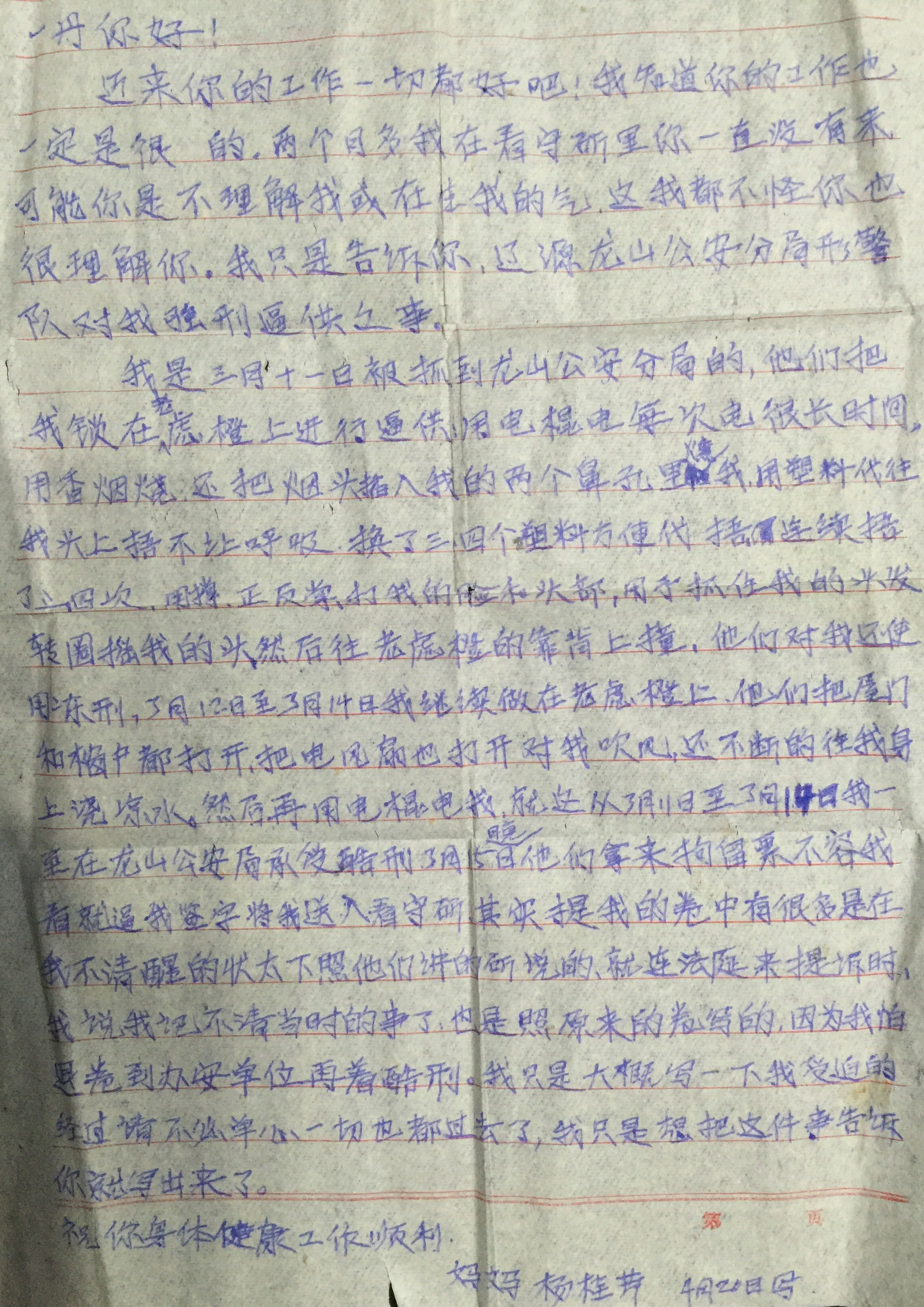 近来你的工作一切都好吧!我知道你的工作也一定很忙的。两个月多我在看守所里,你一直没有来,可能你是不理解我或在生我的气。这我都不怪你,也很理解你。我只是告诉你,辽源龙山公安分局刑警队对我酷刑逼供之事。