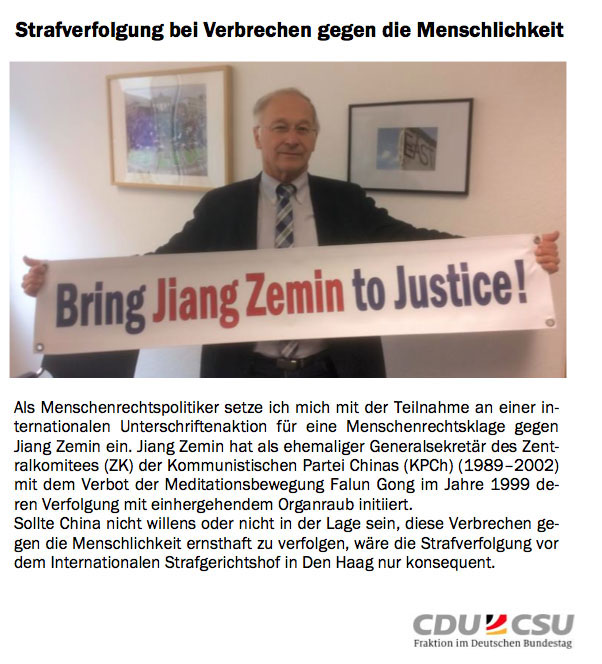 来自德国总理默克尔所在的执政党派基民盟的德国联邦议会人权委员会议员马丁• 帕策尔特 (Martin Patzelt)先生以《追究反人类罪行》为标题在他个人的每星期发表一次的时事通讯中要求追究迫害法轮功学员的元凶江泽民的刑事责任,支持法轮功学员发起的刑事控告江泽民的诉江潮。