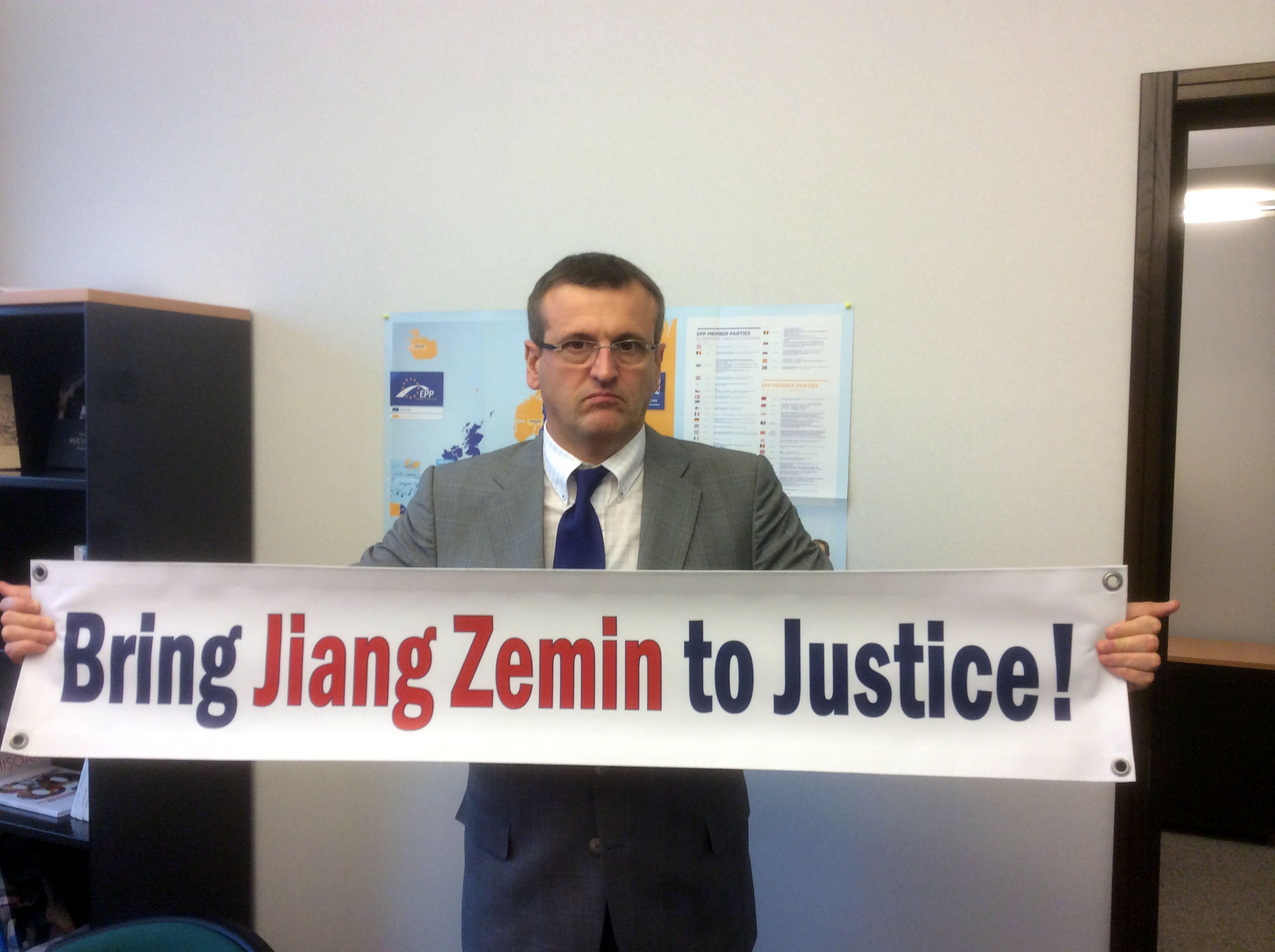 欧洲议会议员克里斯蒂安•旦•培瑞达 (Cristian Dan Preda)手举“法办江泽民!”的横幅