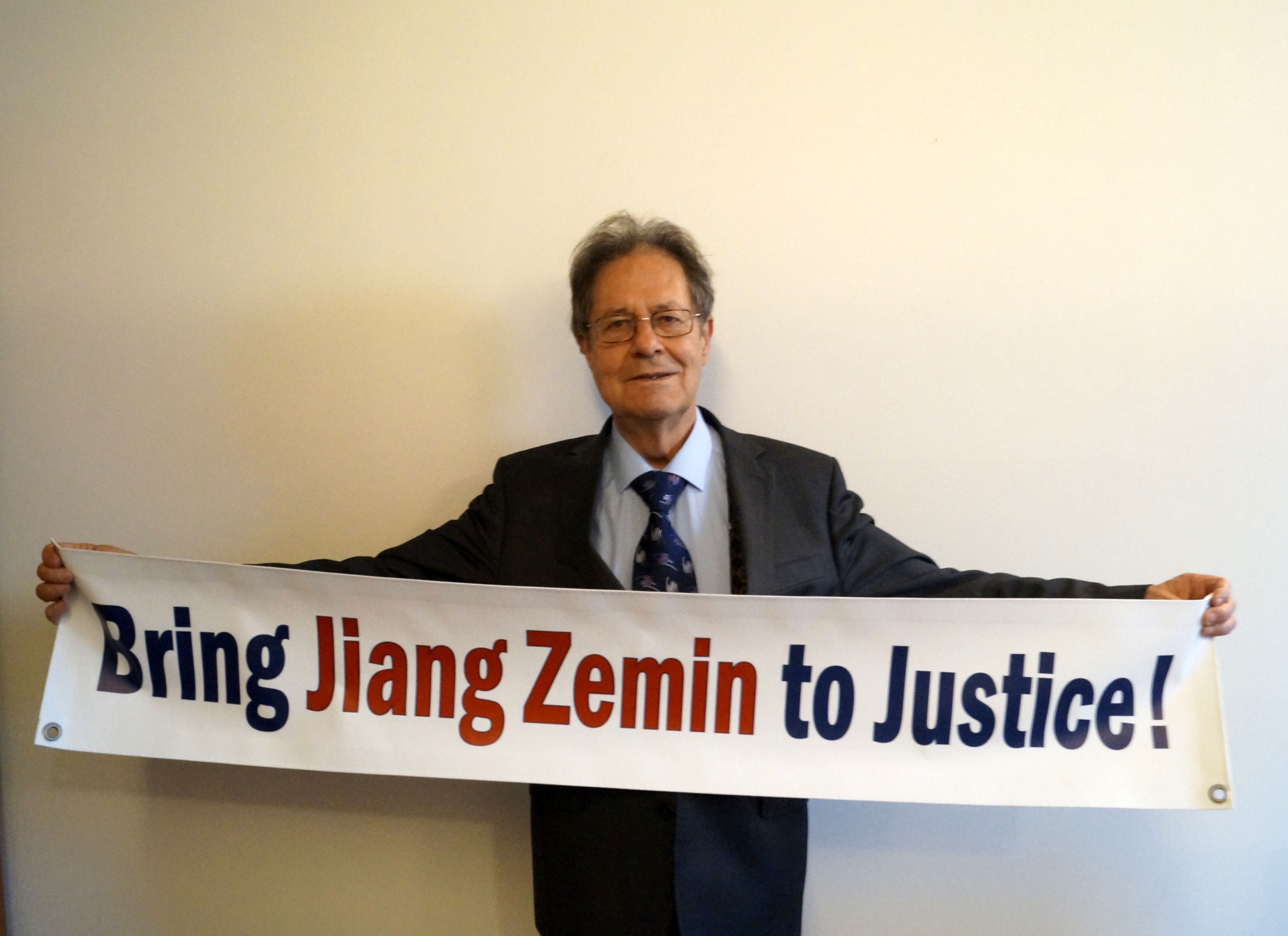 欧洲议会议员克劳斯•布赫纳教授(Prof. Dr. Klaus Buchner)手举 “法办江泽民!”的横幅