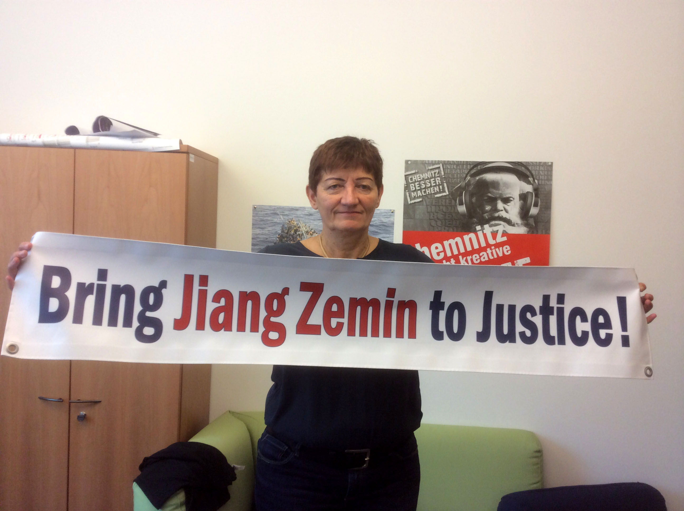 欧洲议会议员科妮莉亚•恩斯特博士(Dr. Cornelia Ernst)手举“法办江泽民!”的横幅