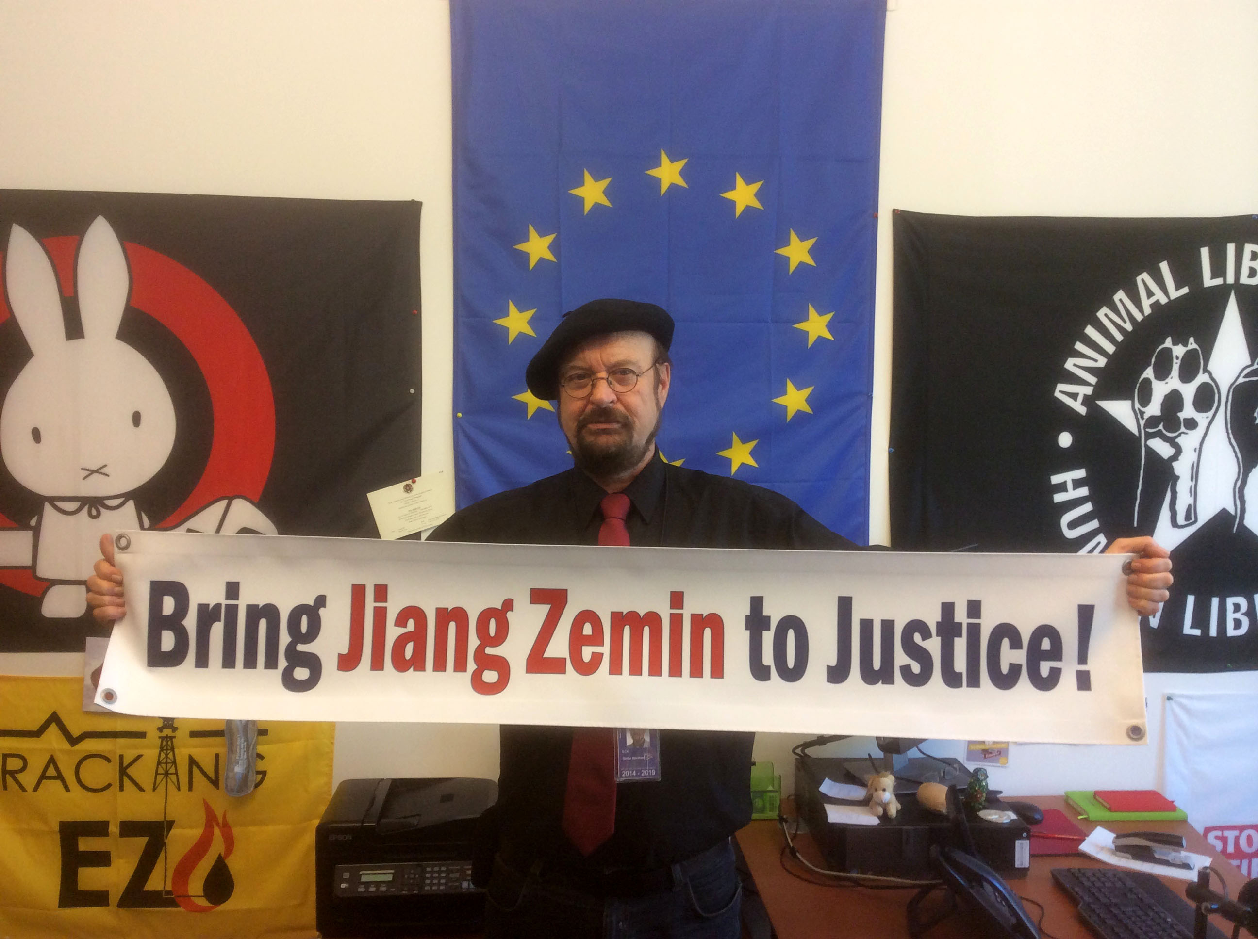 欧洲议会议员斯蒂芬•埃克先生(Stefan Eck)手举“法办江泽民!”的横幅