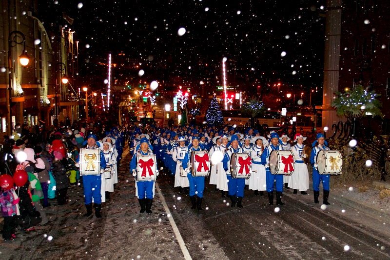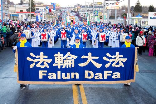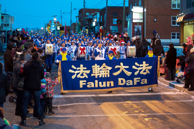 游行从下午三点半开始,从舍布鲁克市中心的King Est街经过一个半小时走到市政厅前边的节庆广场。天国乐团演奏的曲目有《法轮大法好》、《神圣的歌》、《法鼓法号震十方》、《法正乾坤》和《送宝》,加上圣诞节的传统乐曲《铃儿响叮当》(Jingle Bells)带给当地民众非常美好的感受。