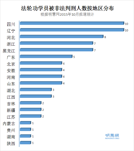 编注:由于中共封锁消息,并且,公检法司部门对法轮功学员的拘捕、起诉、开庭以及判刑因其毫无法律依据,中共法院往往秘密判刑,不通知当事人的家人或辩护律师,明慧网十月份报道的判刑迫害案例可能发生在九月或更早期,有些案例甚至无法得知具体的判刑时间。本文的统计数字是根据明慧网的报道时间来统计的。