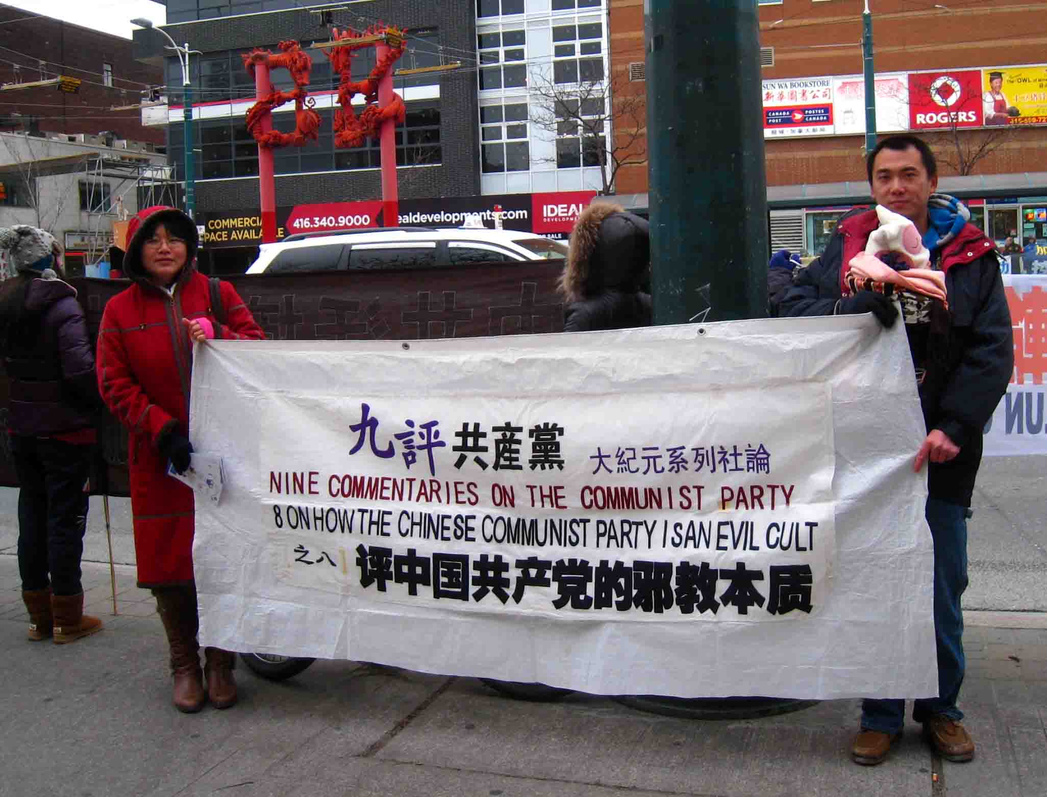 图2:多伦多法轮功学员朱先生和太太李女士在严寒中打横幅