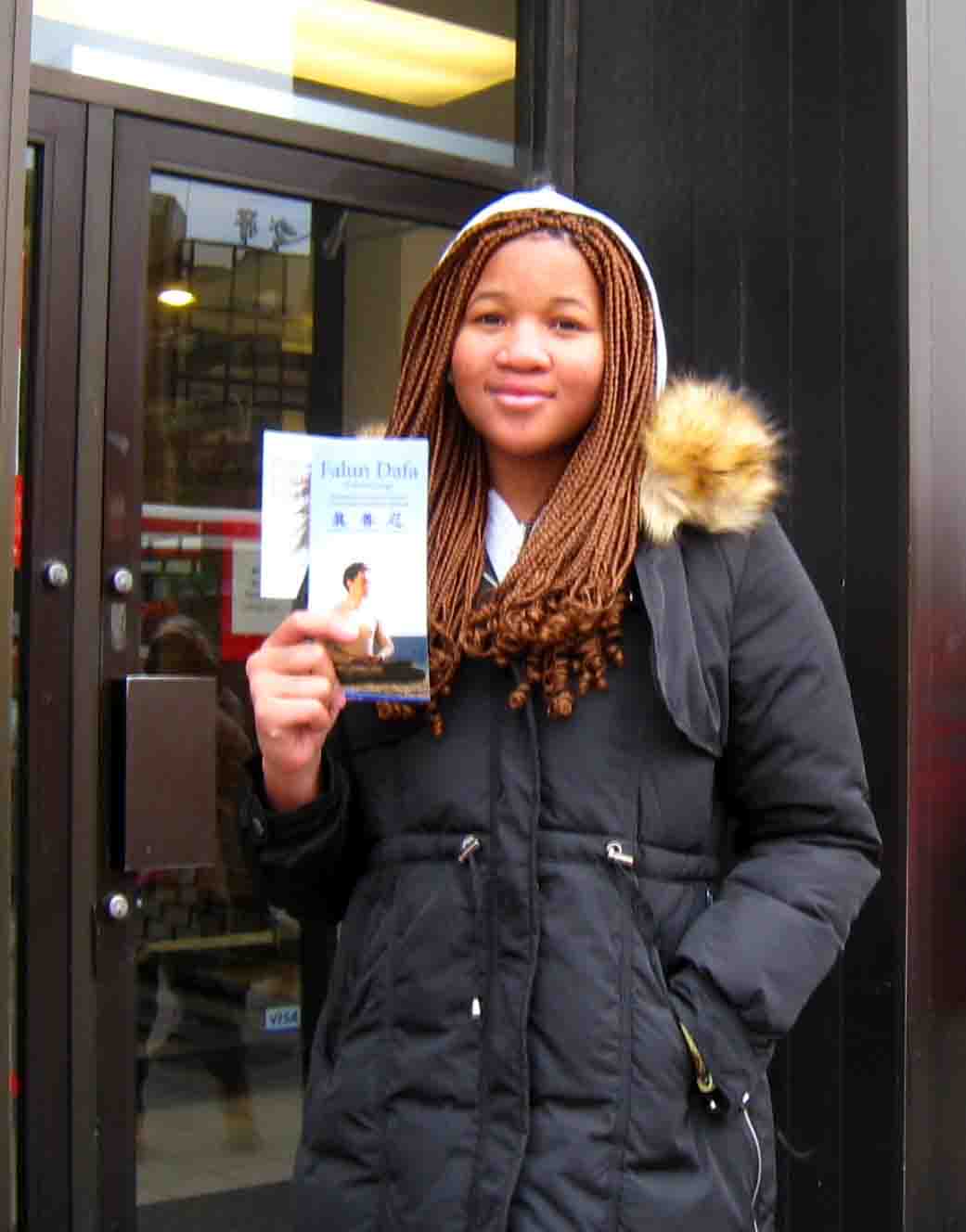 有华人母子二人从活动现场经过,接下了潘女士递过来的法轮功真相传单。潘女士问母子二人说:“你们知道我们在这里干什么的吗?”二人答:“不知道。”潘女士说:“我们在这里是来告诉你们事实真相的。中国现在天灾人祸很多,就是因为中国人被中共的无神论给害了,人们的道德败坏了,好坏不分。中共编造‘天安门自焚’伪案并对法轮功学员进行迫害,甚至活摘法轮功学员器官,触犯佛法,罪过有多大?!善恶有报是天理,咱们是炎黄子孙,不是马列子孙,要退出中共的党团队组织,不与它为伍,不跟它遭殃,对不对?”二人都笑着说“有道理”,并同意退出了共青团和少先队组织。