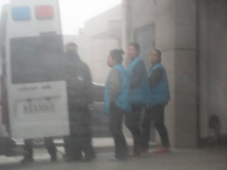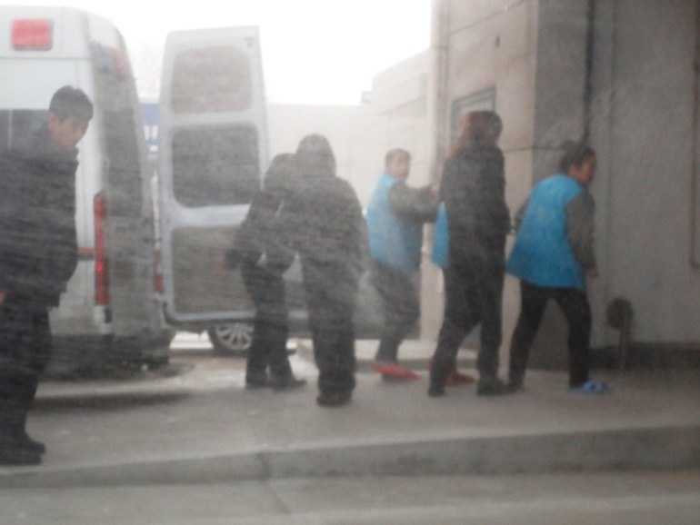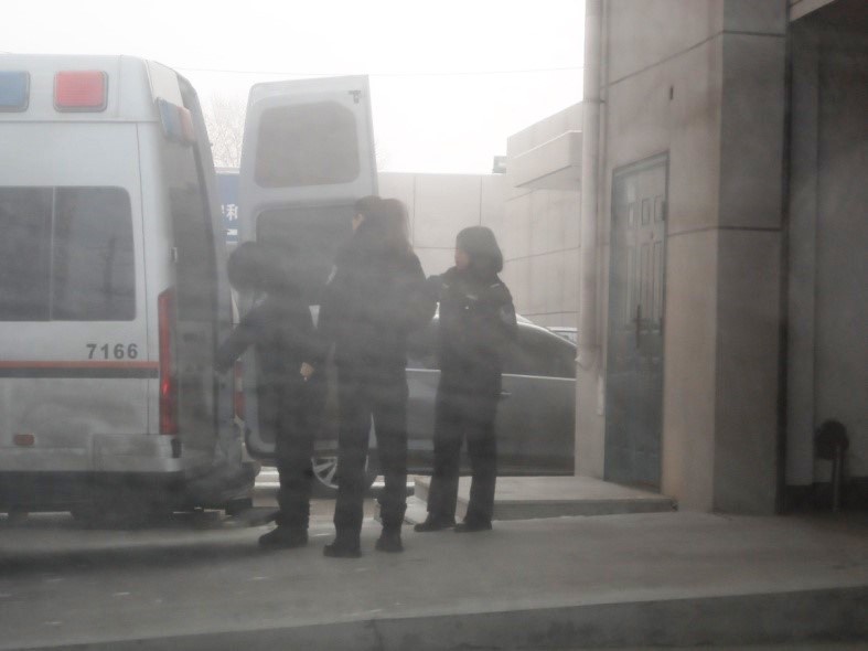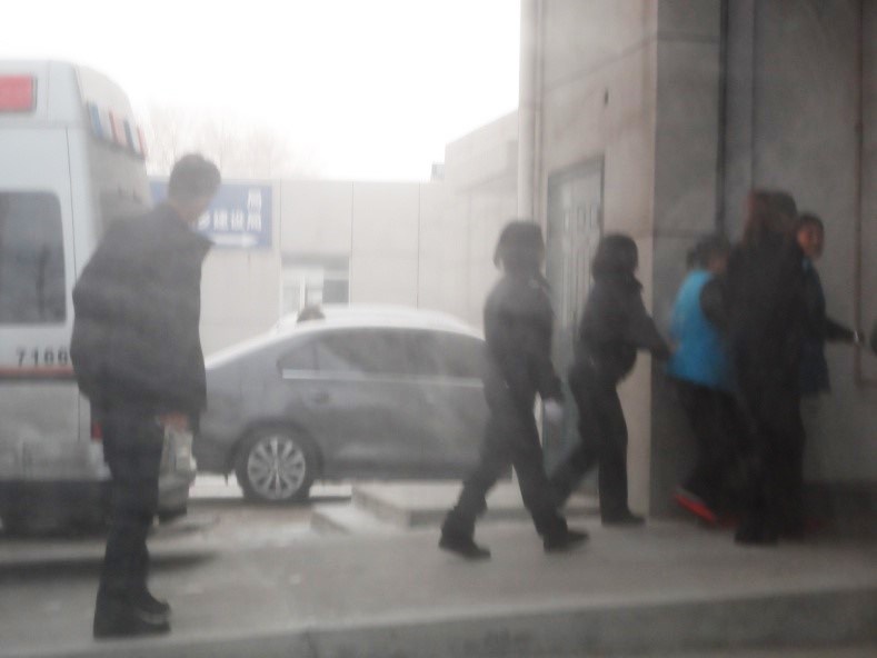 ![]() 图二:俩位大法弟子(穿红拖鞋)下警车、进法院 |