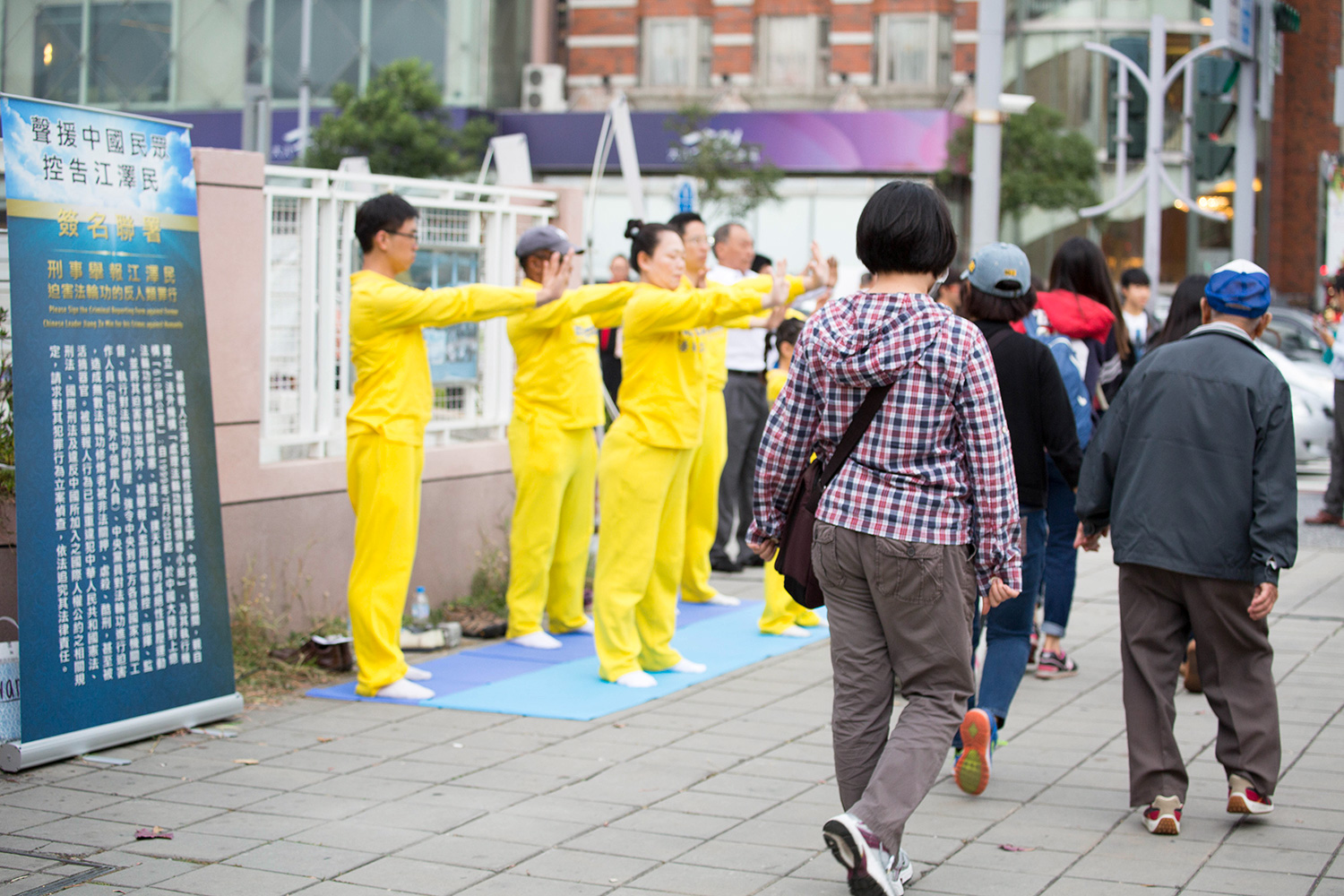 有一团自由行陆客约六人,第一回经过活动现场,看到炼法轮功,表情突然崩得很紧,面容很冷漠,不讲话也不接材料,说他们是自由行。法轮功学员童女士跟他们边走边讲真相,也希望他们能够了解之后,能够出于善心,举报江泽民,声援诉江,为下一代增福报。后来这一团大陆游客们来回走了三、四趟,然后脚步渐放慢,表情也开始和善了,其中有两人伸手索要材料说回旅馆会细看。