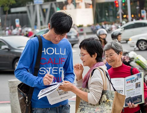 有几位民众乍听之下不敢相信说:“现在怎会有人这么残忍,活摘器官牟取暴利!”接过说明材料后仔细看了起来,其中有一个还眼里泛着泪水说:“这太残忍了,一定要告他,制止迫害。”并签名举报恶首。大部份善良的台湾民众一了解迫害真相都会签署反迫害,还说加油,一位妇人鼓励说:“要广传真相,积沙成塔,大家都站出来制止恶行,停止迫害的一天很快到来。”
