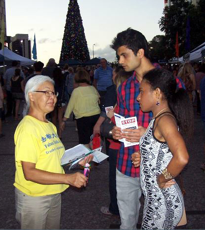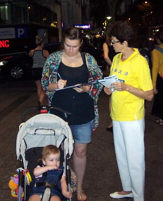 在征签过程中,很多当地西人都表示早已听说过中共活摘法轮功学员器官的罪行。他们非常同情法轮功,憎恶中共恶行,但又不知道怎样支持法轮功,现在可以签名支持“诉江”帮助制止迫害,非常高兴,并感谢法轮功学员给他们提供了支持正义、表达心愿的机会。