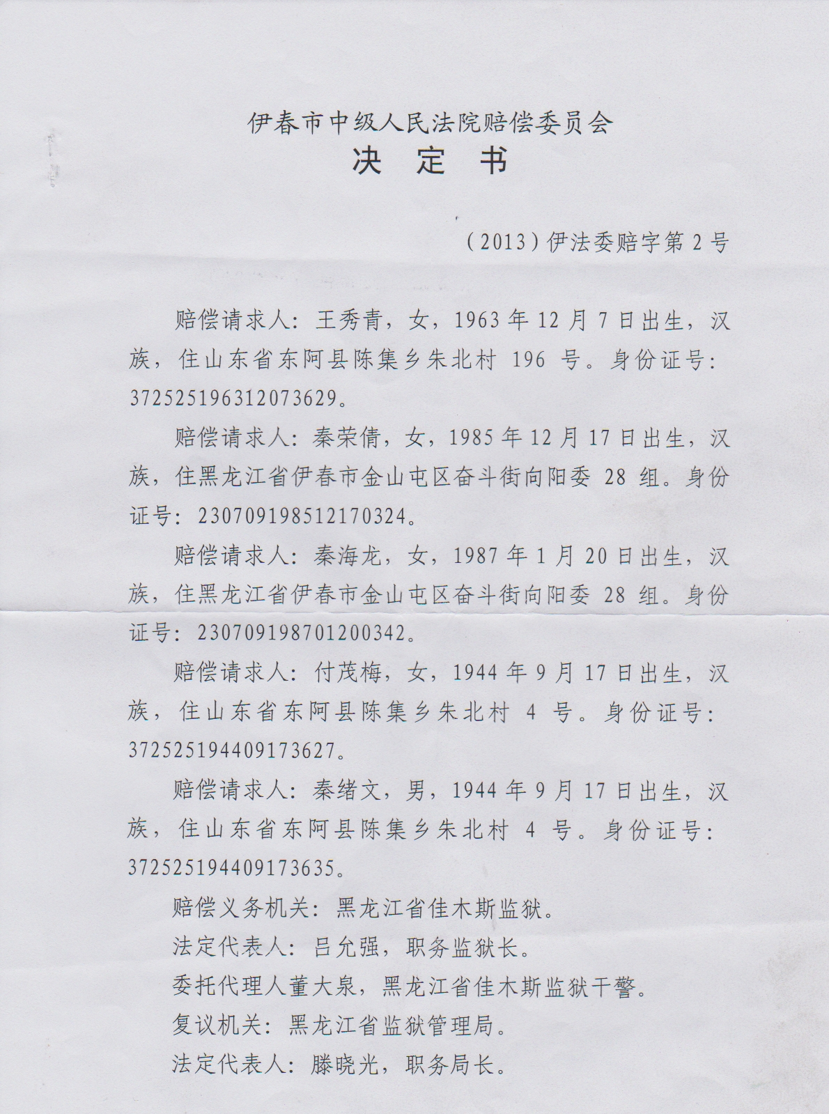 秦月明家属历经千难万难,向佳木斯监狱、合江地区检察院、黑龙江省监狱管理局申请和复议后,又经国家赔偿程序诉讼至黑龙江省高级法院赔偿委员会。黑龙江省高级法院于二零一一年九月八日立案受理。