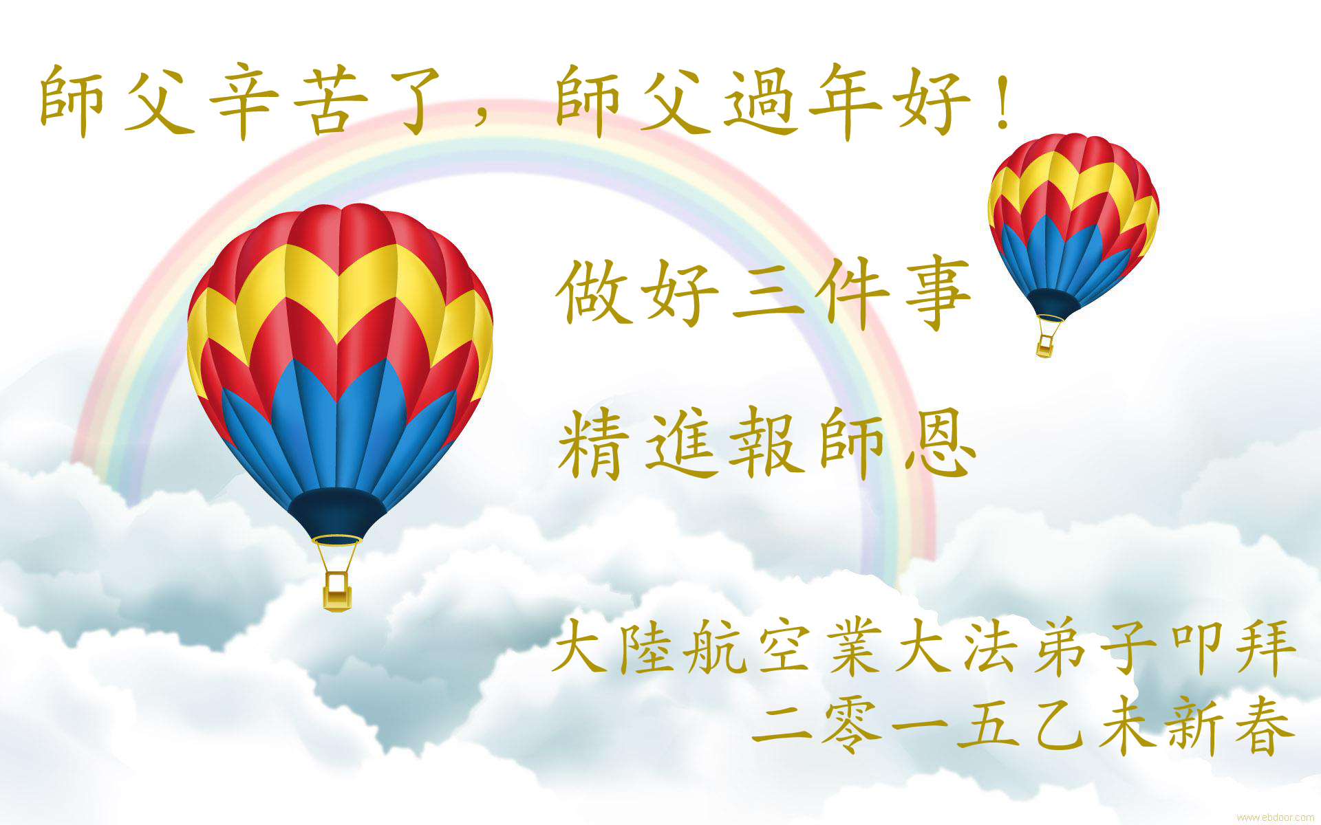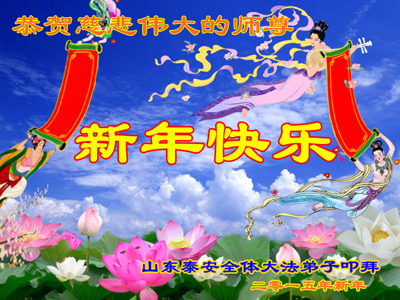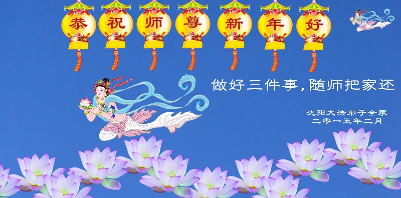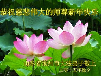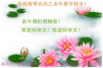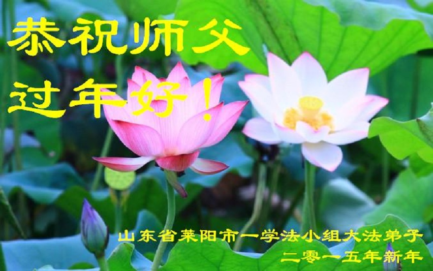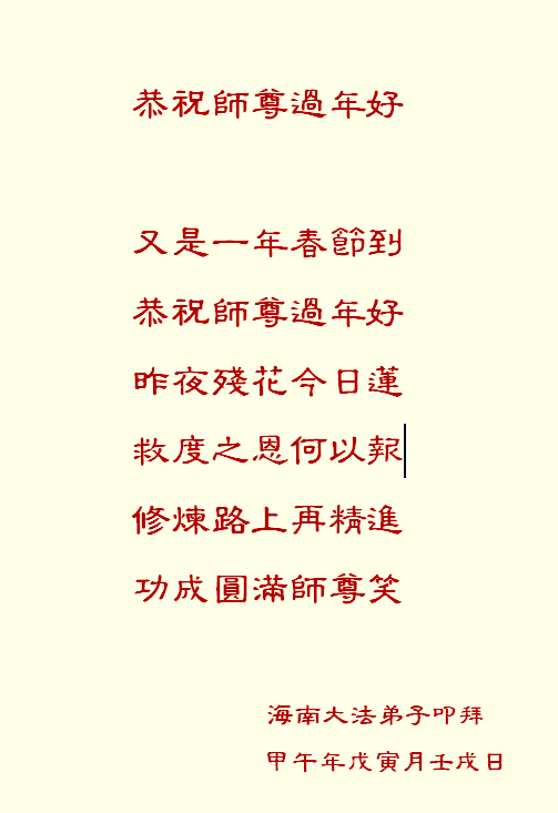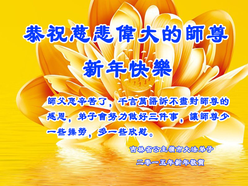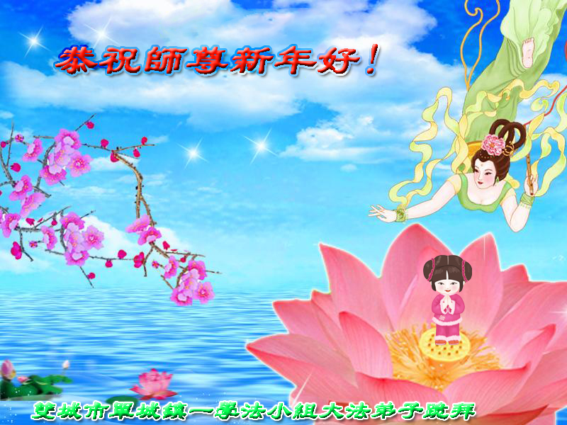 尊敬的师父您好!甲午年即将过去了,这一年我们没有白过,在师父的指导下,我们各方面都取得了一定的成绩。但是,与师父的要求相比还差的很远。我们决心在乙未年,更加听师父的话,加倍努力,克服松懈情绪,拿出得法初期的那股劲头,進一步按师父的要求做好三件事,兑现自己的誓约,救度更多的众生,早日圆满跟师父回家。请师父放心。跪拜师尊!