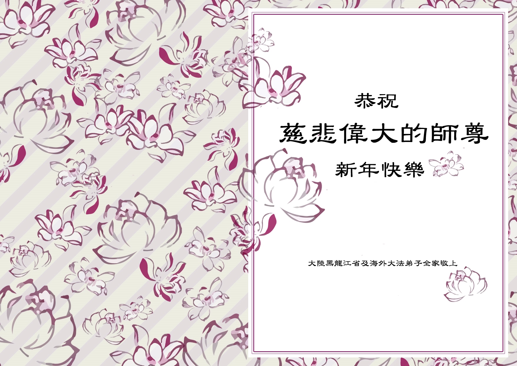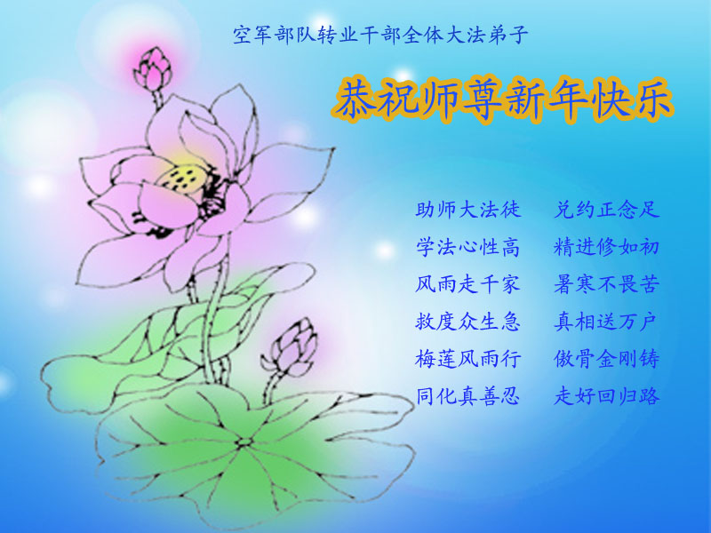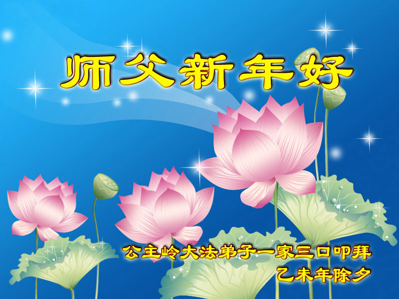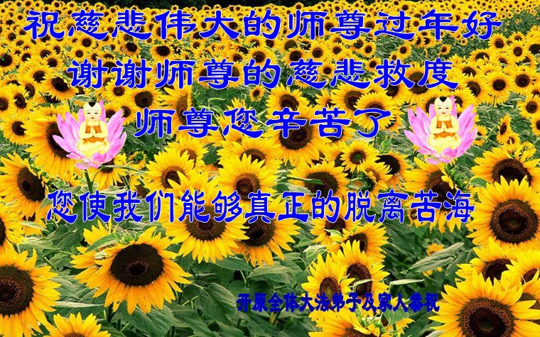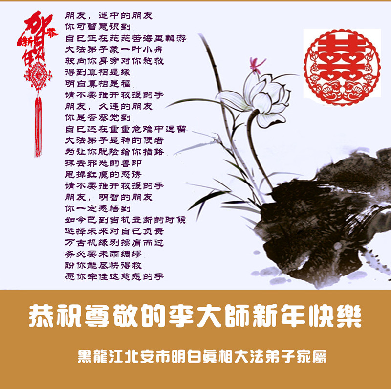 我们是佳木斯大法弟子家属,新年到了,我们在这里恭祝李大师过年好!感谢李大师的慈悲救度!