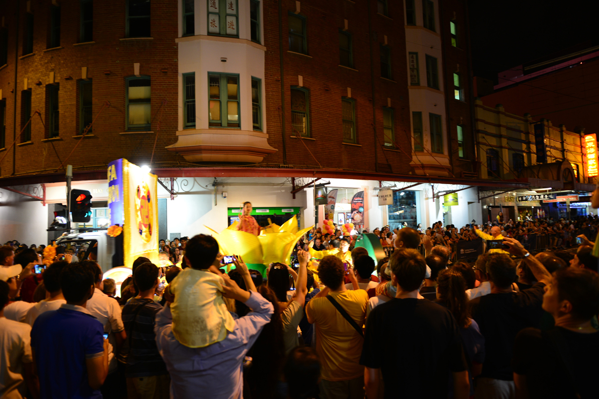 入暮时分的悉尼市中心乔治大街上,一派喜气洋洋,代表着羊年的旗子到处飘扬,吸引了里外二十多层人群来围观这一年一度的壮观节日庆典,超过十三万观众沿街观看。