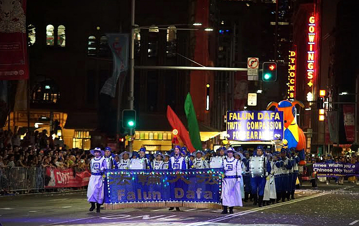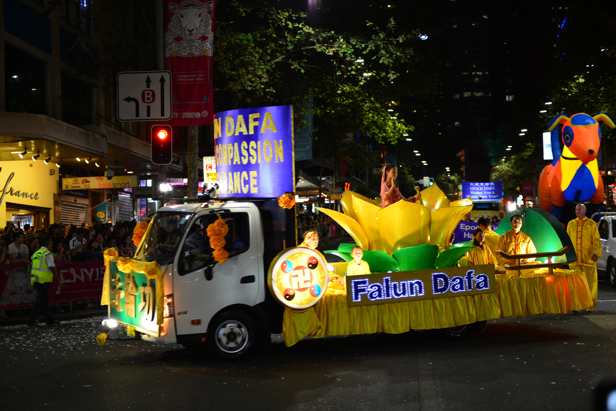 法轮功的方阵中还有坐在花车上金光闪闪大莲花中的仙女;和花车上来自中国、澳洲和法国三个家庭组成的展示法轮功五套功法的炼功团体,学员们和两旁的观众互相招手致意,问候“新年好!”正如花车前方和两侧分别展示出的中、英文“法轮大法”和“真善忍”给夜幕中的观众带来希望和智慧!