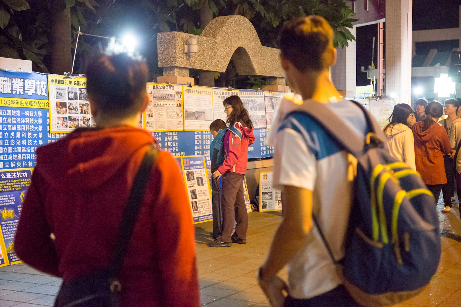 从台北回高雄外婆家玩的林先生家族一群,走过腰鼓队表演前时说:“这里也有法轮功,法轮大法好,在高雄没有共产党来闹他们!”他说:“在台北101大楼时常看到几个共产党员乱吼乱闹一通,看起来很凶煞、暴力,跟法轮功学员和平,善良很是对比,他觉得法轮功是正的,台湾政府要保护这个信仰、善良的团体,他希望能赶快把共产党驱离台湾,台湾就能安宁一些。”