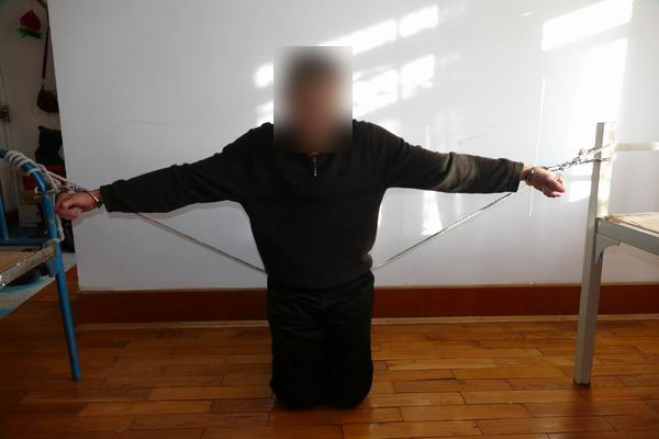 当天下午一点左右,金言鹏问我写不写,我没配合,他过来就给我一个大嘴巴子。说:你敬酒不吃,吃罚酒。把我拽到桌子上,他们又一拥而上强制写了一遍。写完后,他们拉开两个床,把我拽过来,手脖子上缠上毛巾,戴上手铐,分别铐在两张床的床头角铁上,角铁是80公分高、2×2公分的厚壁角铁。角铁上面焊了个耳朵,用铁丝捆到两张床床头上。把我两手臂拉成一字形,人只能弯着腰站着。他们叫我蹲着,我不蹲,他们就使劲的按着我,让我蹲着。我不听他们的就坐到地上。朱少鹏抱着喊着让我蹲,我就是不蹲,他和金言鹏按着我跪在地上,把我两脚用绳子捆住,又把绳子的两头分别在两张床头角铁的小耳朵上拉紧、拴住,他俩把两张床往两边猛劲儿一拽,我的胳膊被拉直,手腕被铐紧,此时被捆紧的双脚就离地了,只有双腿膝盖着地,蹲铐成了跪铐。