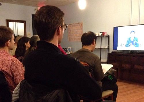 ![]() 图1:参加九天班的学员们通过讲课录像倾听李洪志师父讲法 |