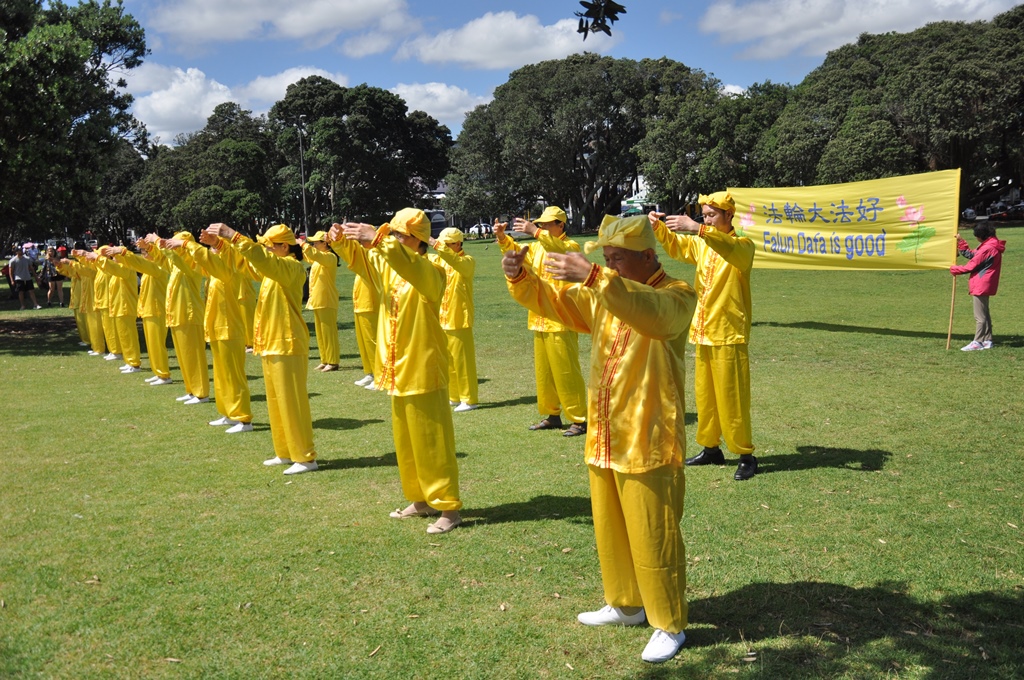 ![]() 新西兰奥克兰的法轮功学员在著名景点米慎湾(Mission Bay)海滩集体炼功,展现大法的美好。 |