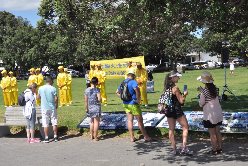 二十多位身着黄色炼功服的法轮功学员为人们展示了法轮功五套功法,并有一位学员在旁边同时向观众介绍法轮大法洪传世界的盛况。许多人被这祥和的炼功音乐和法轮功学员们舒缓优美的动作所吸引,驻足观看和了解什么是法轮功。
