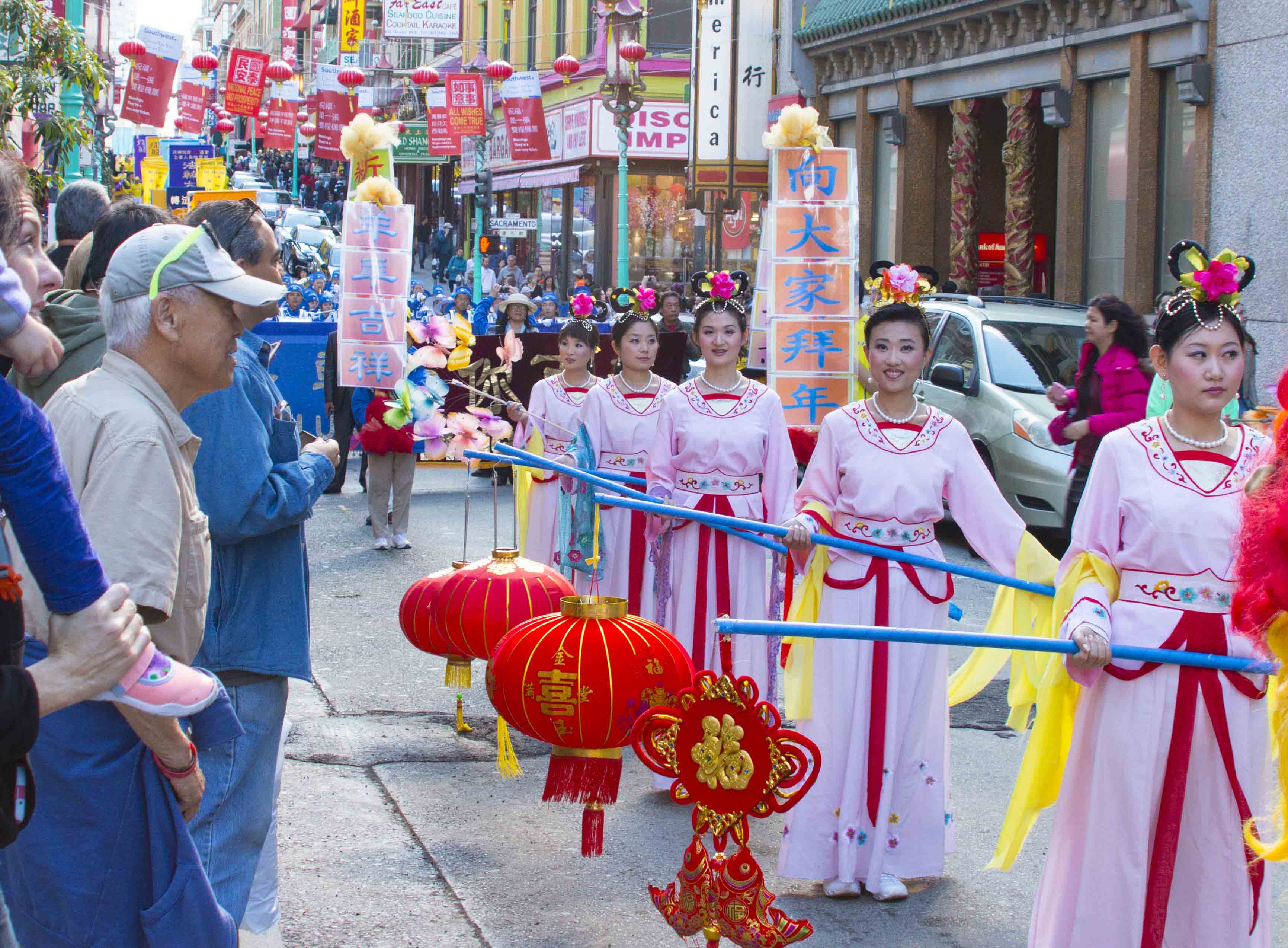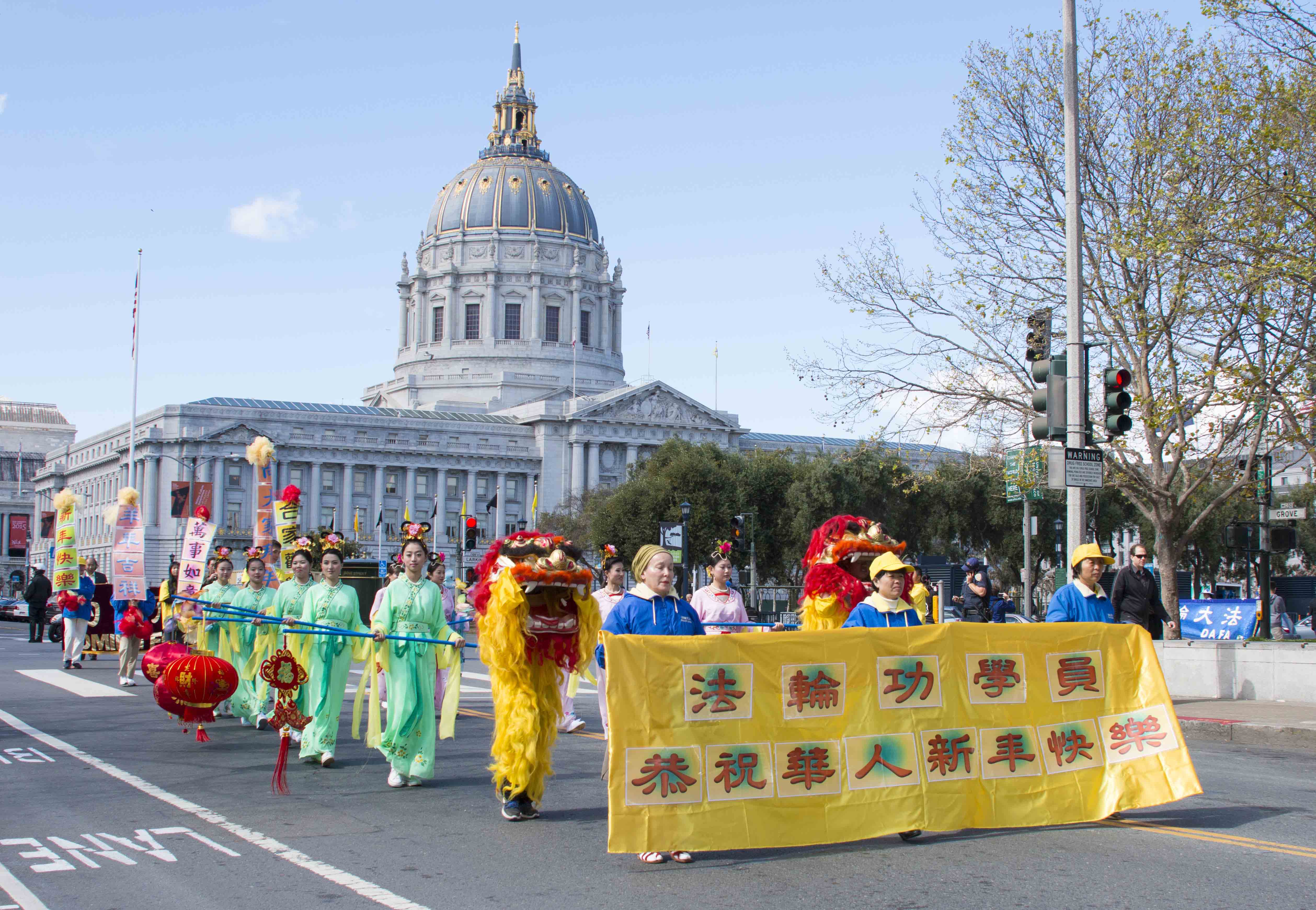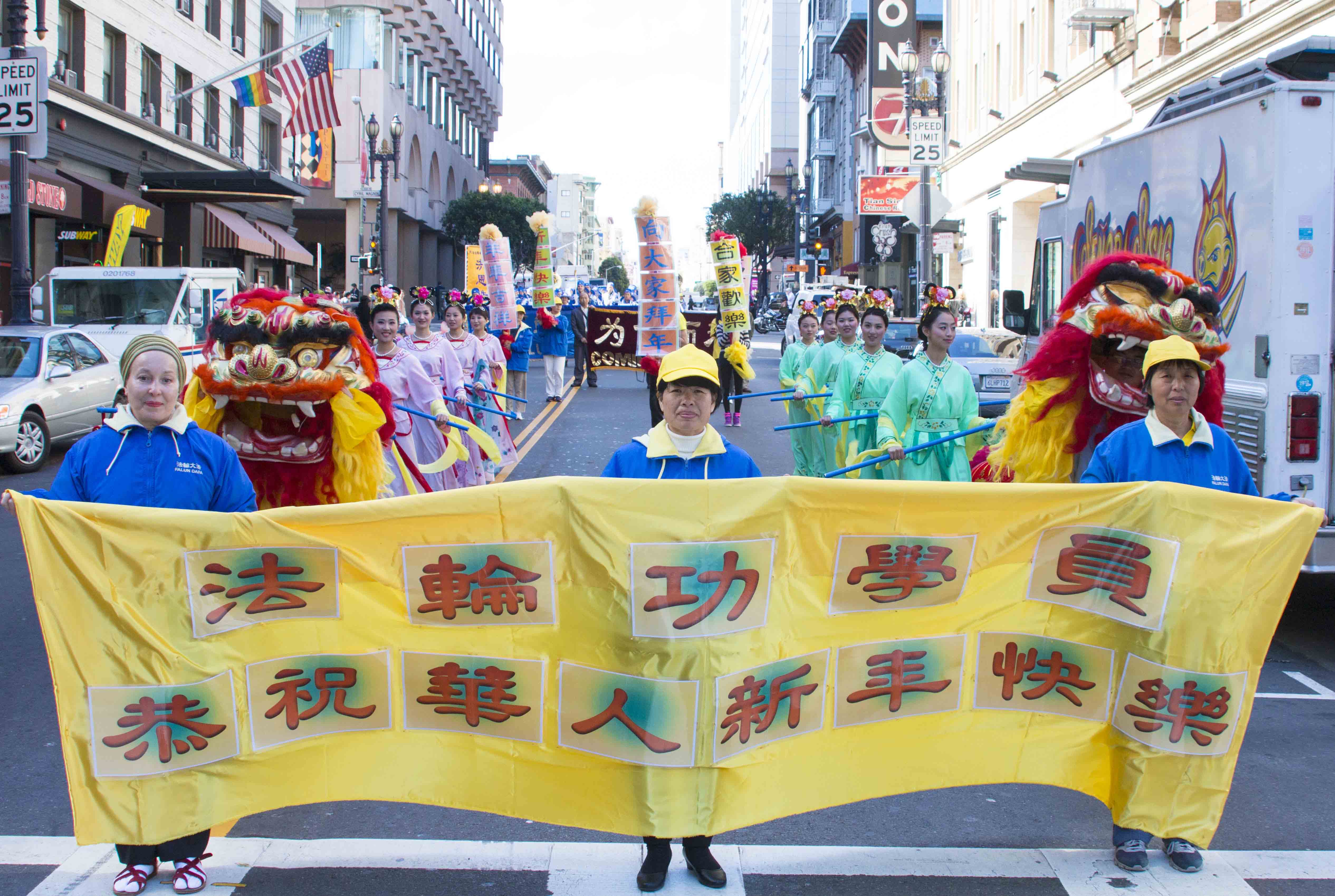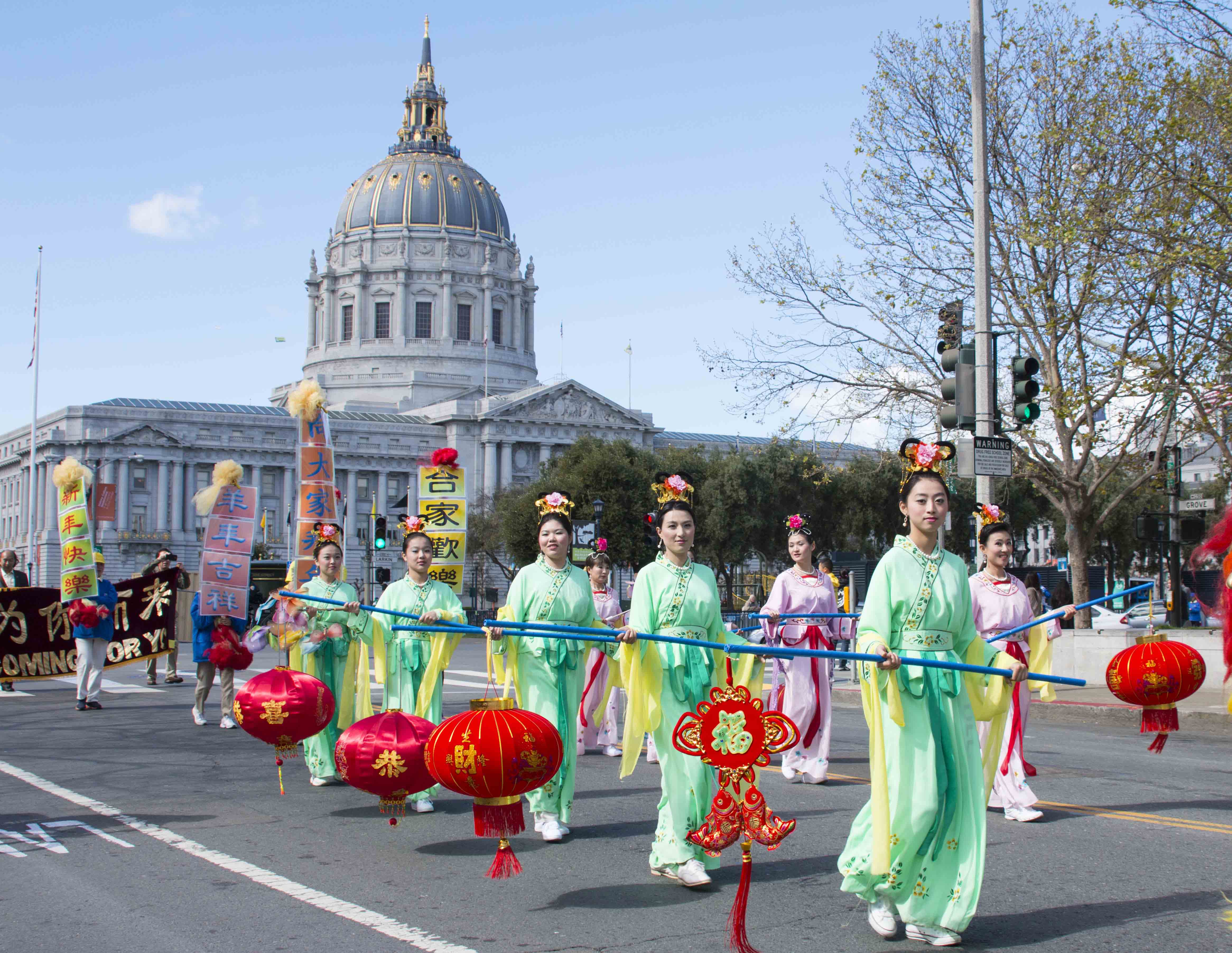 中午十二点,由旧金山法轮大法修炼者和支持者组成的游行队伍从旧金山市政府广场出发,走在最前面的是给华人拜年、身穿过年服装手提灯笼弘扬中华传统文化的仙女队和小弟子队。紧接在后的是身穿古装、阵容壮观的美西天国乐团,之后有旗队、法轮功功法展示队、花车等。最后是呼吁广大中国民众退出中共迎接美好未来的退党队。