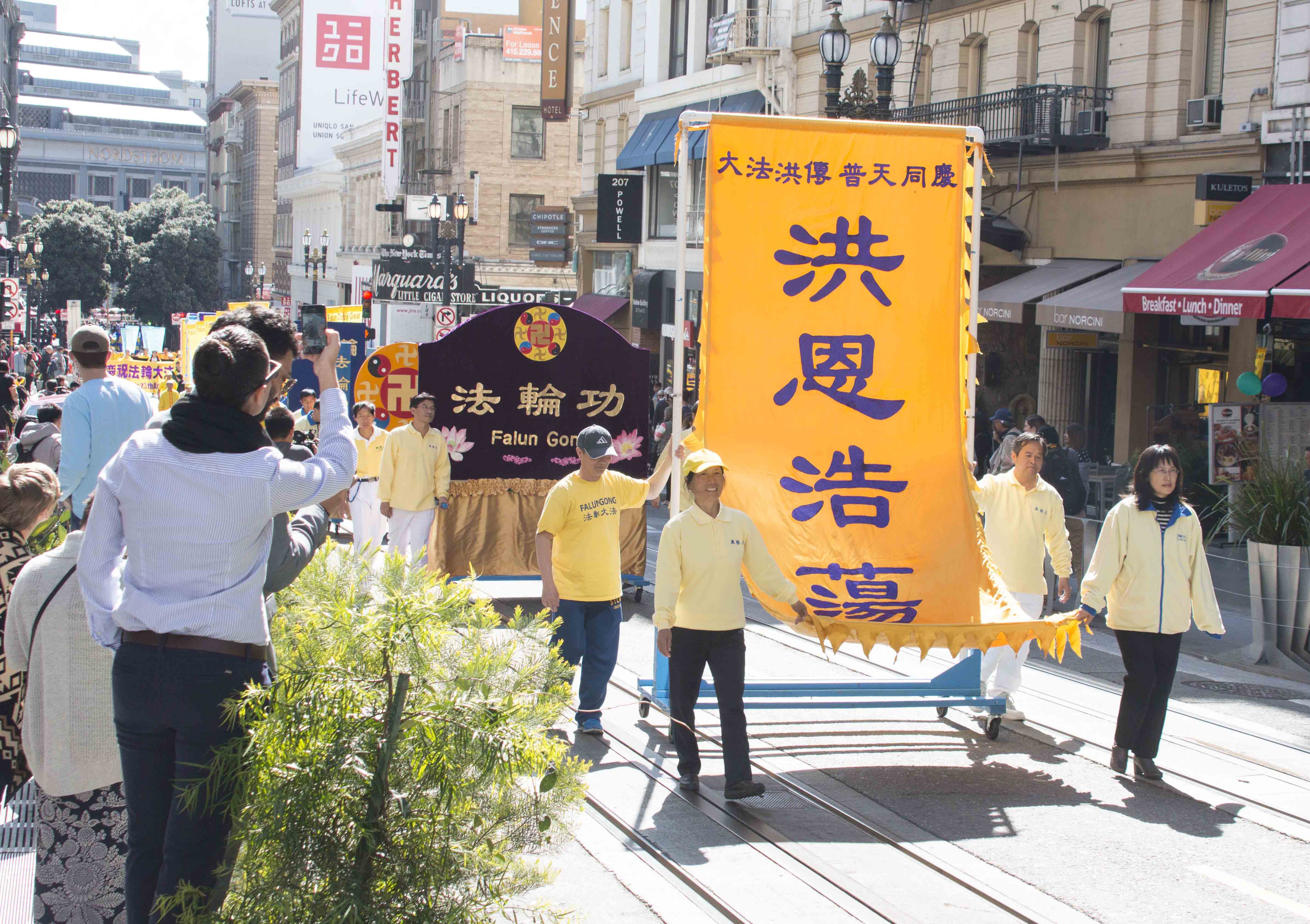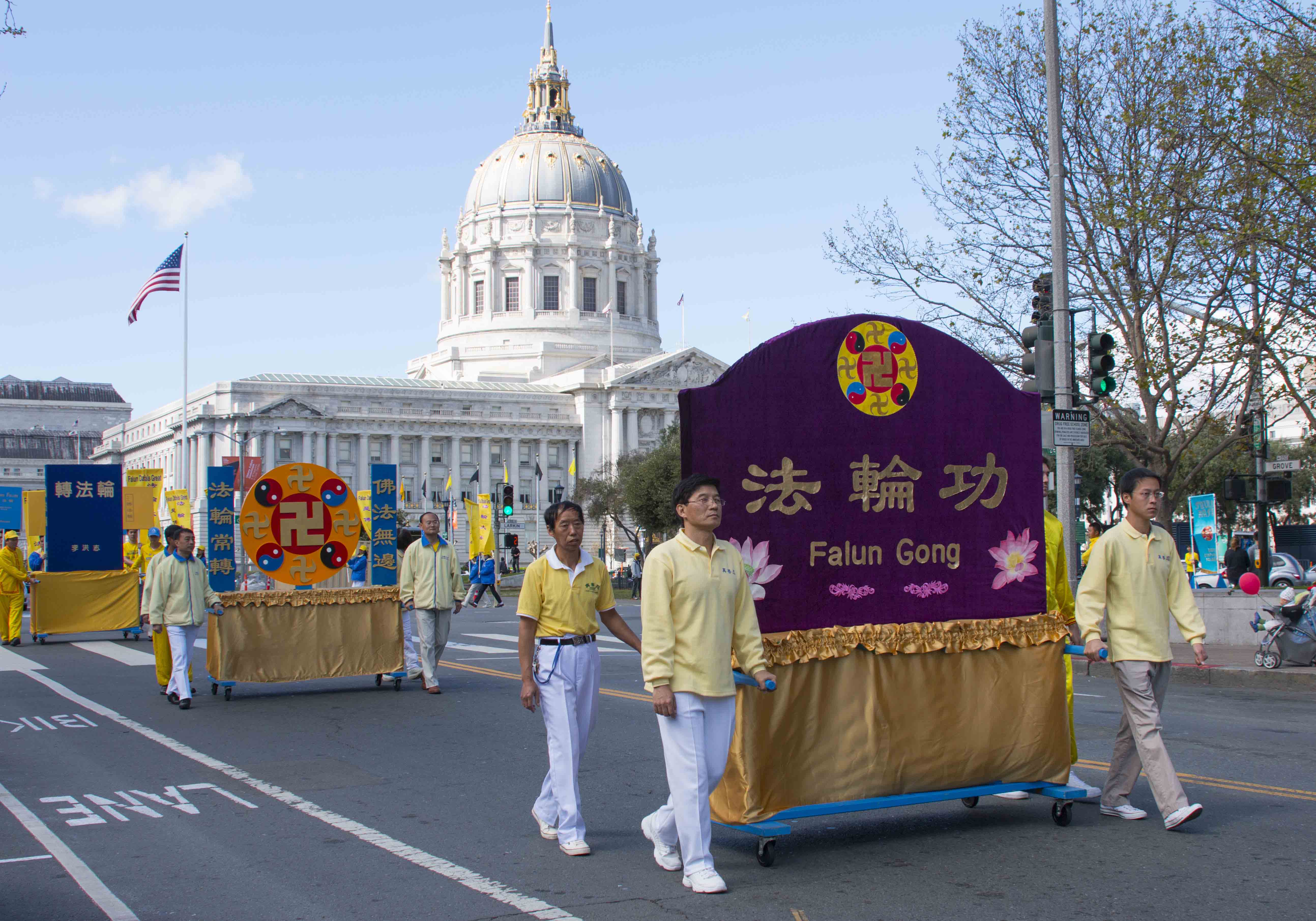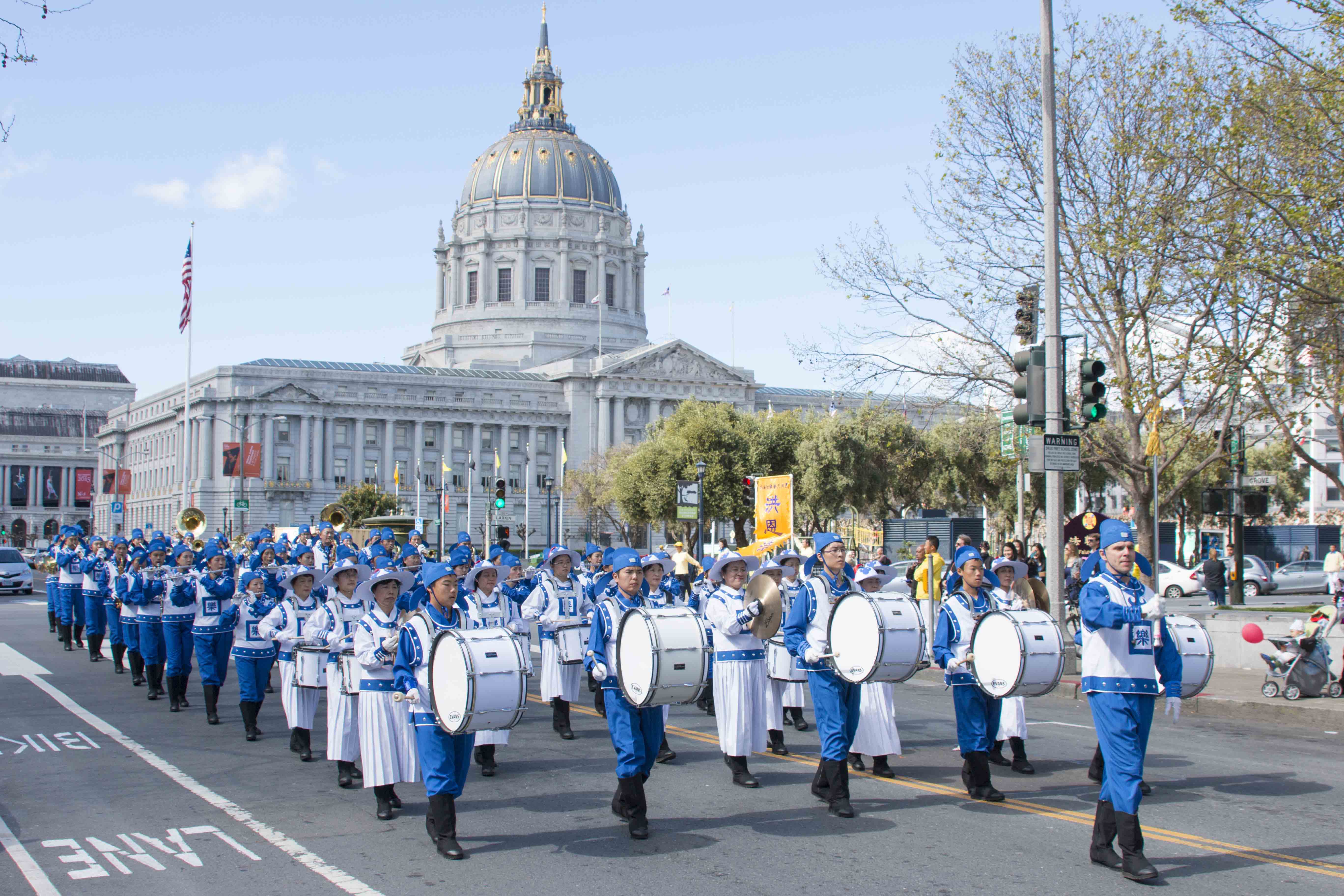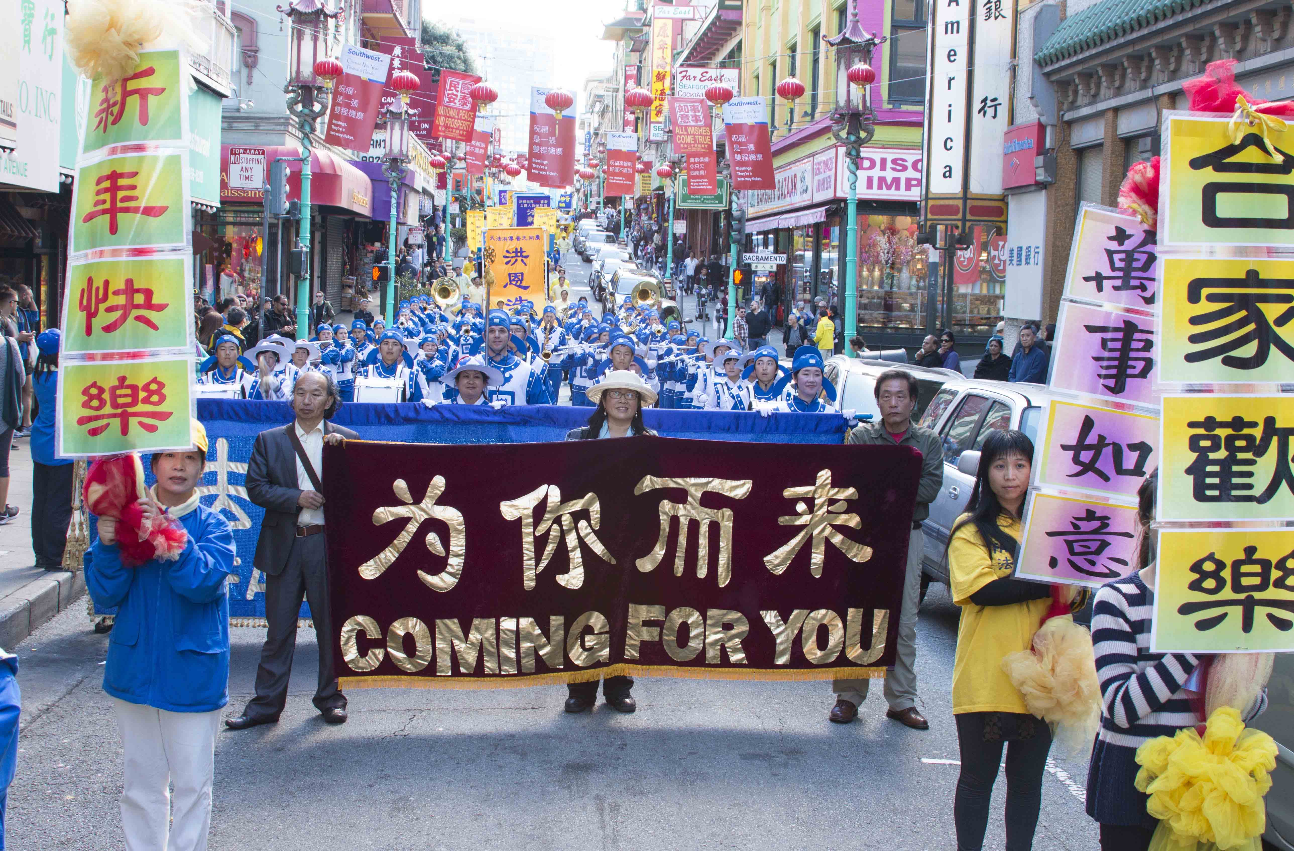 中午十二点,由旧金山法轮大法修炼者和支持者组成的游行队伍从旧金山市政府广场出发,走在最前面的是给华人拜年、身穿过年服装手提灯笼弘扬中华传统文化的仙女队和小弟子队。紧接在后的是身穿古装、阵容壮观的美西天国乐团,之后有旗队、法轮功功法展示队、花车等。最后是呼吁广大中国民众退出中共迎接美好未来的退党队。