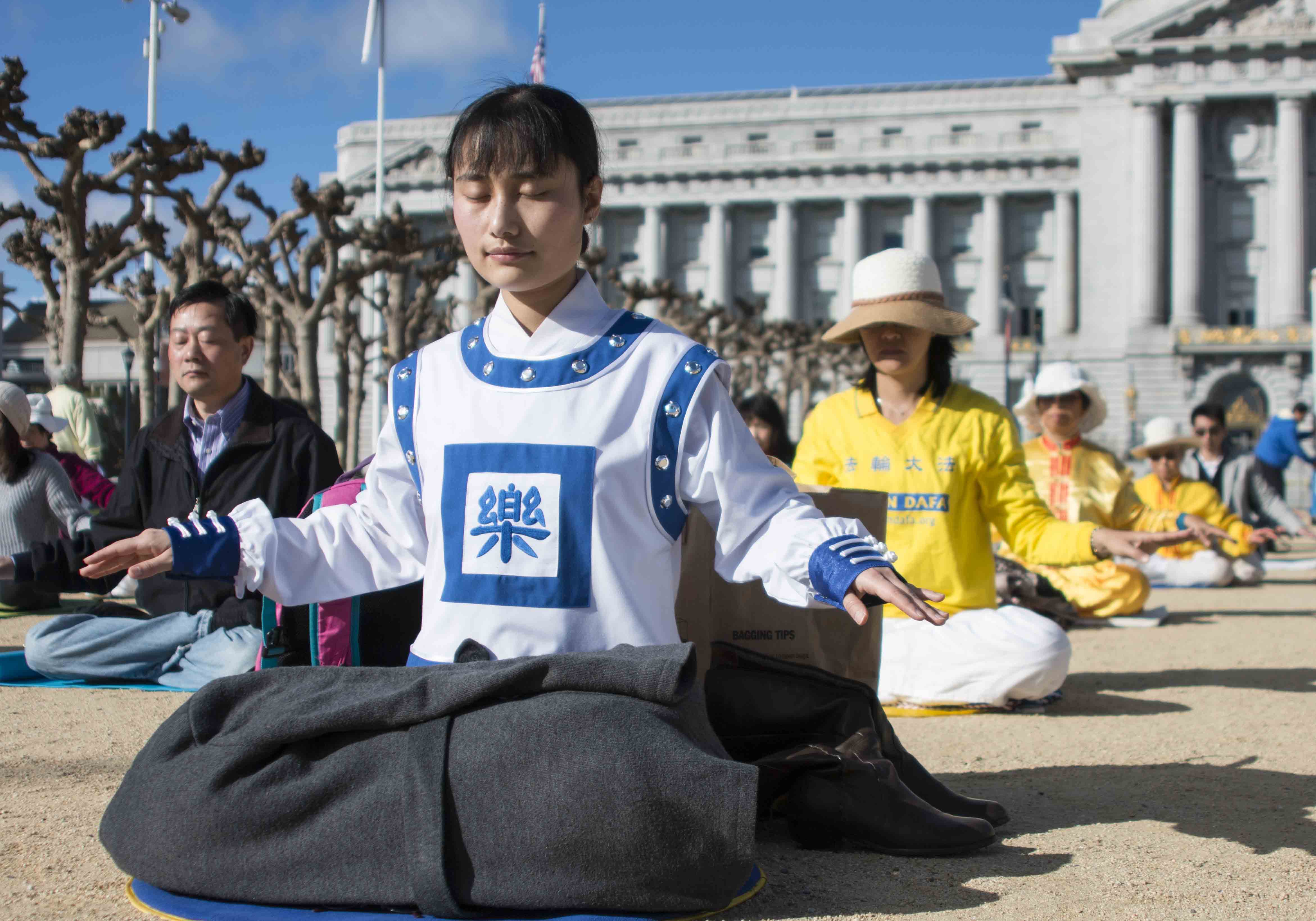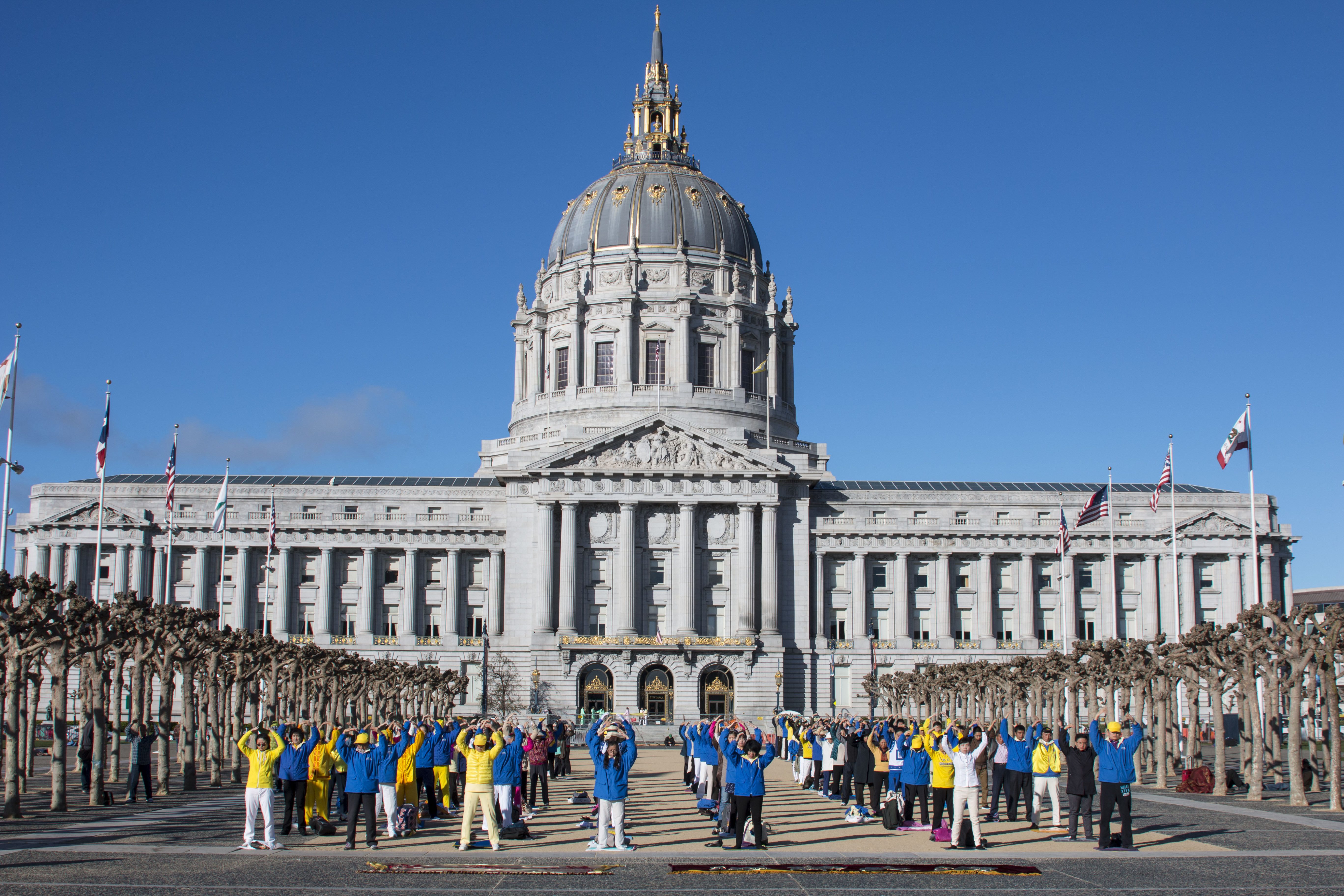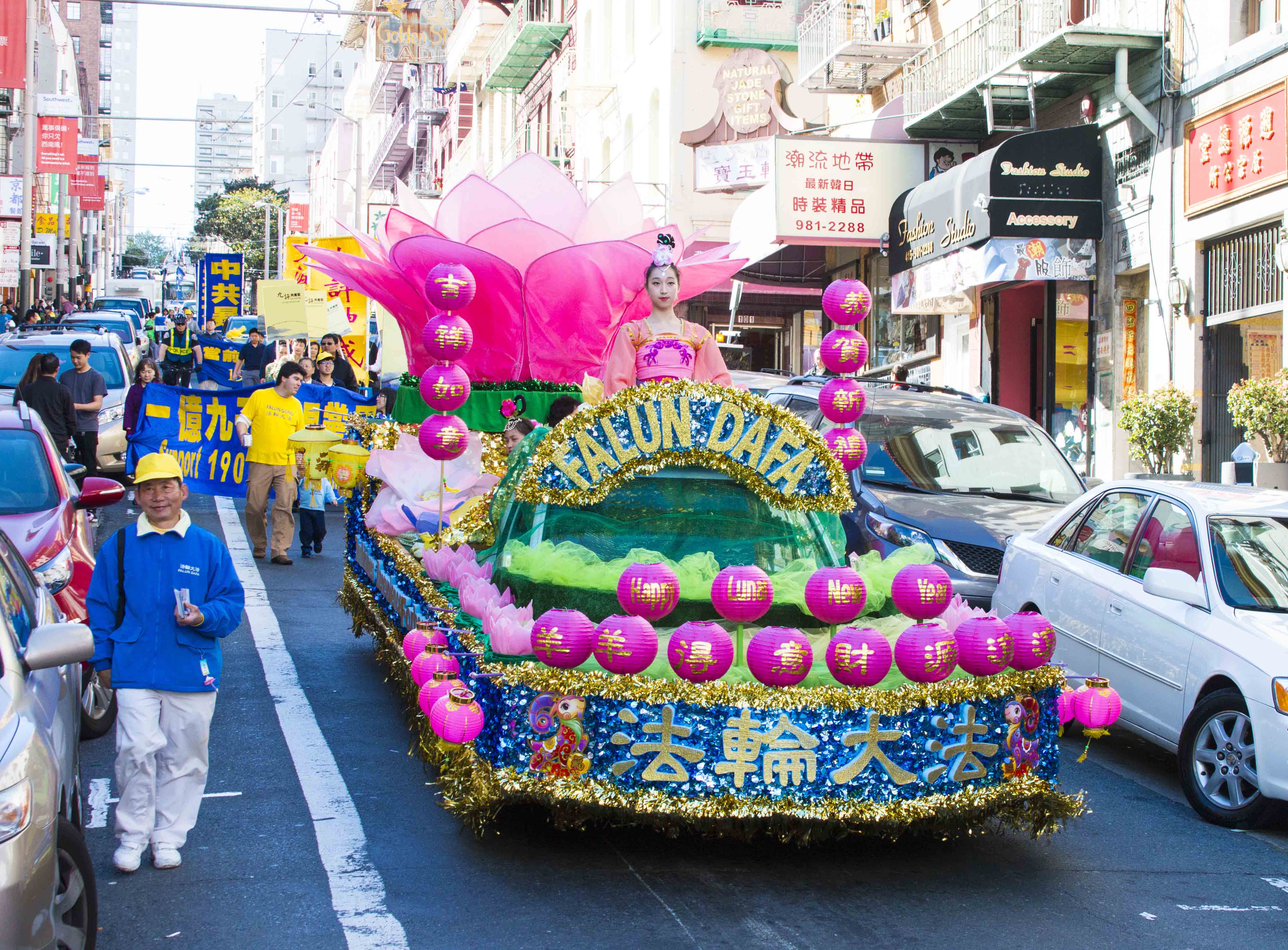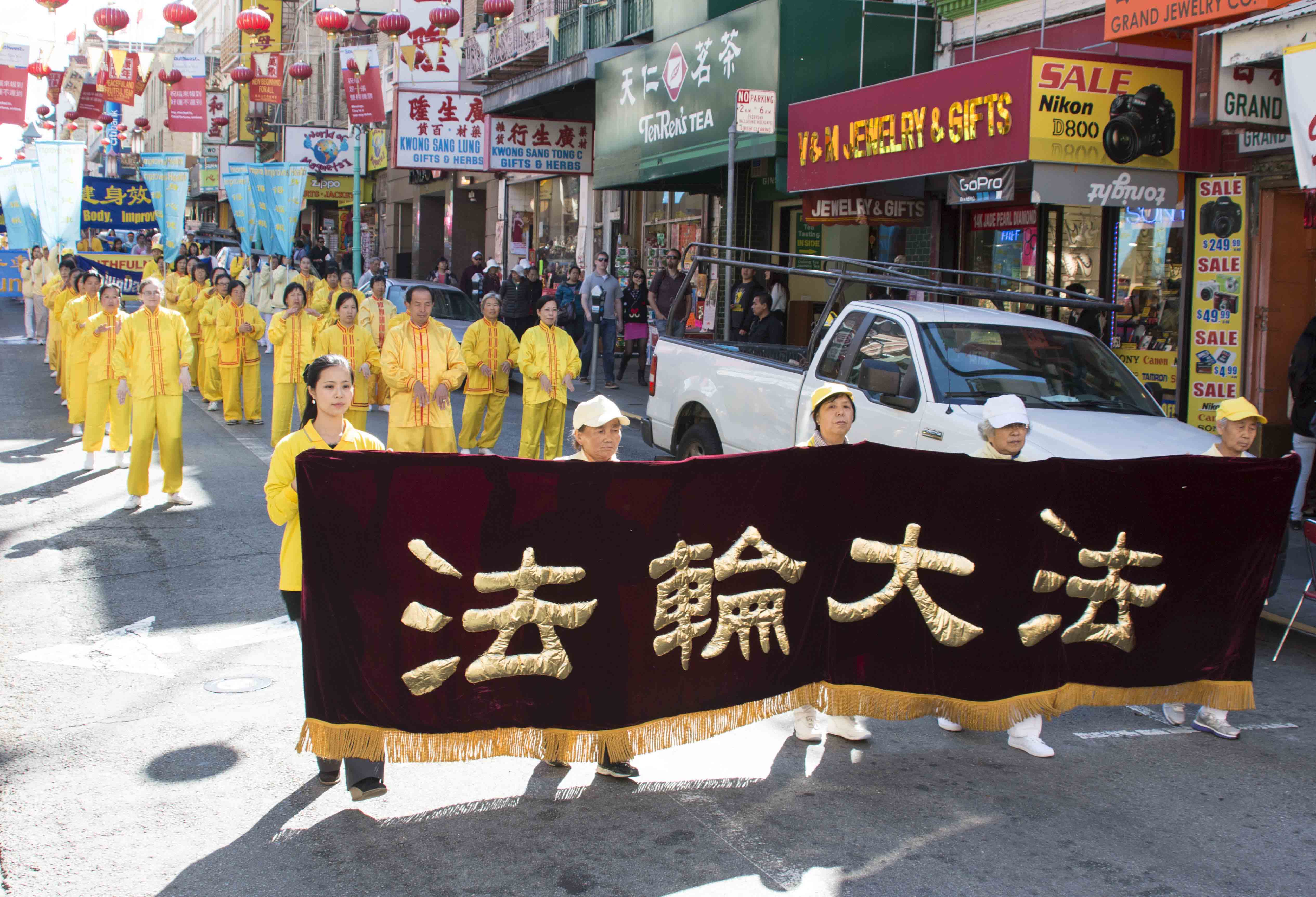 中午十二点,由旧金山法轮大法修炼者和支持者组成的游行队伍从旧金山市政府广场出发,走在最前面的是给华人拜年、身穿过年服装手提灯笼弘扬中华传统文化的仙女队和小弟子队。紧接在后的是身穿古装、阵容壮观的美西天国乐团,之后有旗队、法轮功功法展示队、花车等。最后是呼吁广大中国民众退出中共迎接美好未来的退党队。
