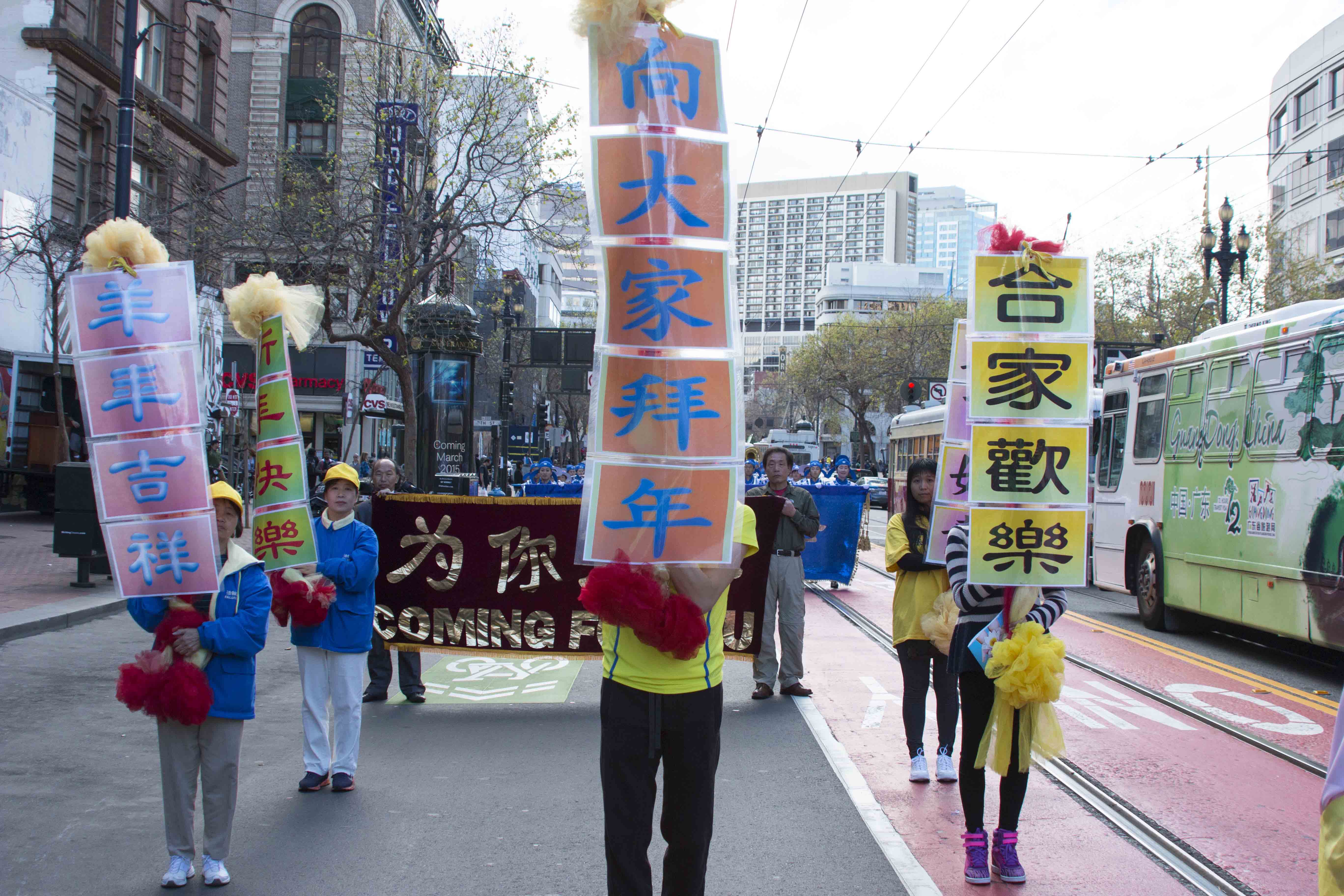 【明慧网二零一五年三月二日】(明慧记者王英旧金山报道)二零一五年二月二十八日是夏历乙未年大年初十,美国旧金山湾区的法轮功学员在旧金山市中心和中国城举行游行,欢庆中国新年,并在中国城举行讲真相活动,给旧金山民众拜年送祝福。