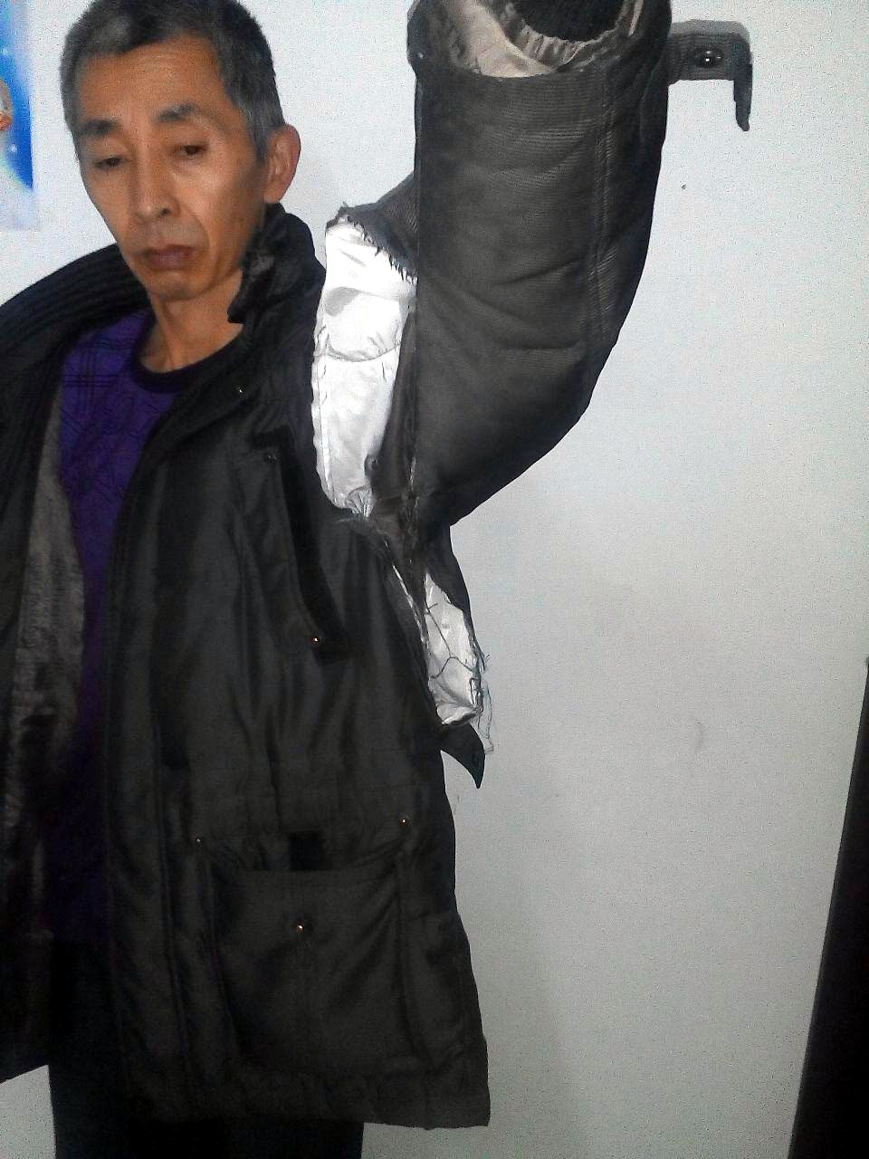 ![]() 石孟昌抵制警察的暴力绑架,衣服被撕坏,膝盖被扭伤 |