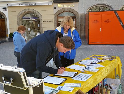 本次活动在位于艺术节主办地的萨尔斯堡市中心老城内老市场广场(Altmarkt)举行。很多民众驻足观看法轮功学员的真相展板。在看到法轮功学员的功法演示,和知道了中共非法迫害法轮功的真相后,都震惊这么祥和的功法,竟然遭到这么残酷的迫害。在反对活体摘取法轮功学员器官的征签表格上签字后,都纷纷地摇头表示不可思议,无法想像。