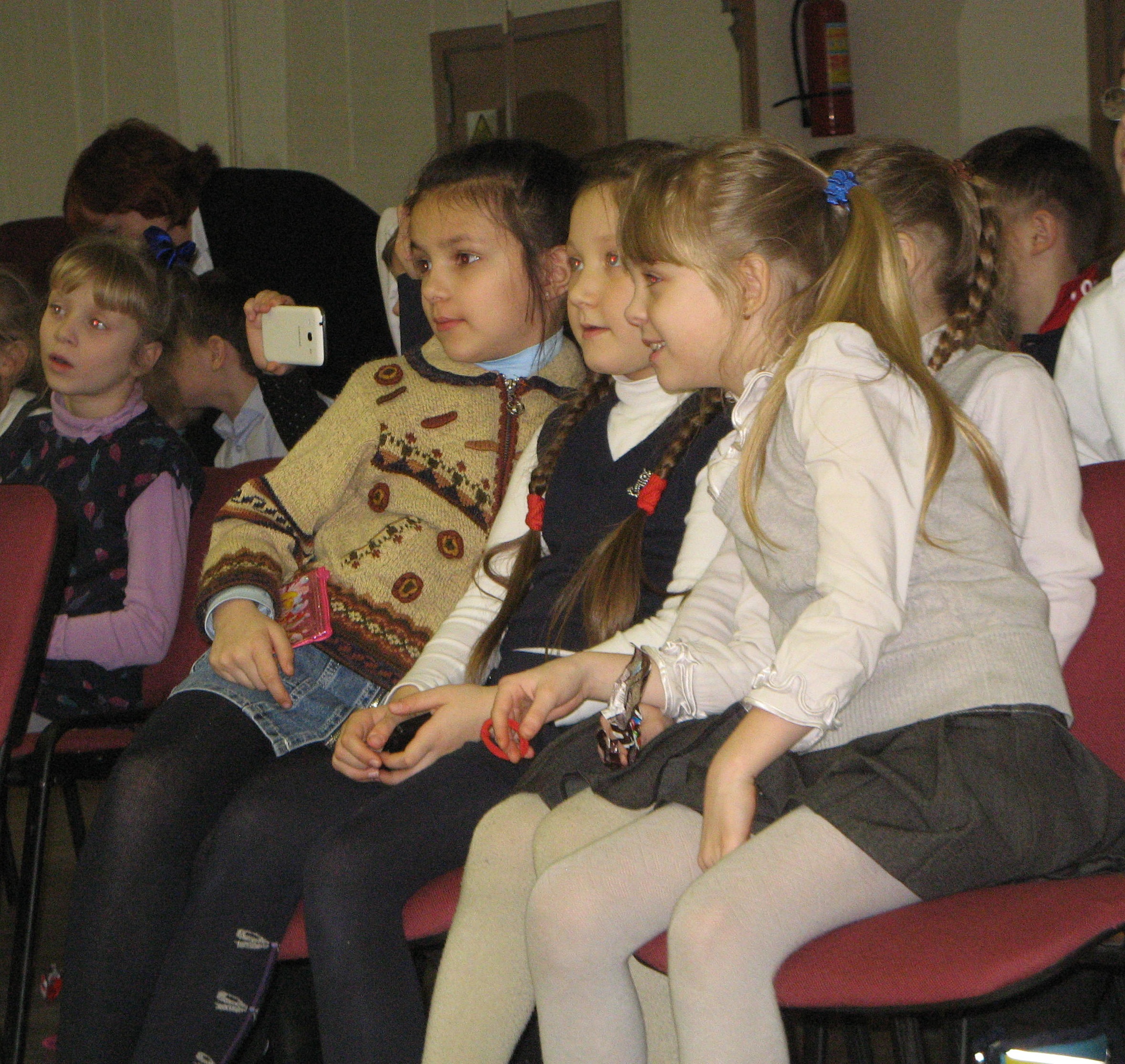 【明慧网二零一五年三月四日】二零一五年中国新年期间,圣彼得堡法轮功学员来到周边地区罗曼诺索夫市一所小学弘法,向六十多名学习中文的一年级小学生介绍法轮功,告诉他们法轮功的“真、善、忍”原则,孩子们很快就学会这三个字的写法,很多人还跟学员们学习法轮功功法。