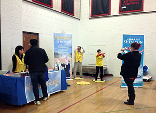 ![]() 昆市新年联欢会上,参观者拍照法轮功功法示范、了解真相。 |