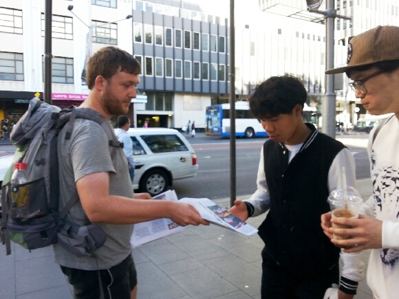 ![]() 德国游客菲尔(Phil,左)主动派发揭露中共活摘器官的真相资料给路人 |