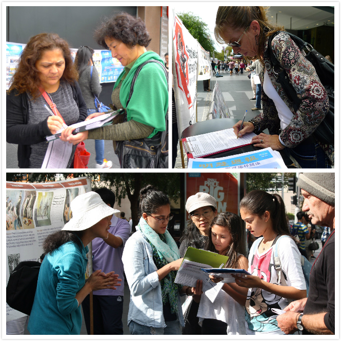 很多过路的当地民众都主动来真相展板前签名支持法轮功反迫害。有些市民签了名后还建议法轮功学员把这个征签表放到网上去,就会有更多人来签名。