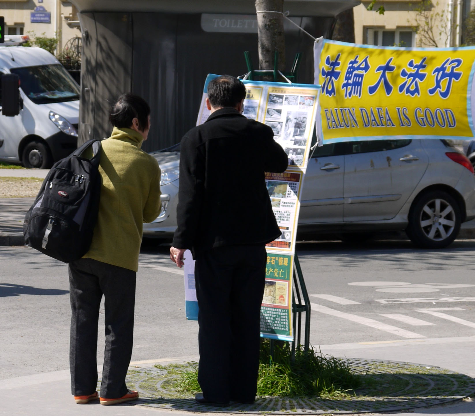 ![]() 中国大陆游客认真观看巴黎埃菲尔铁塔下退党点的真相展版 |