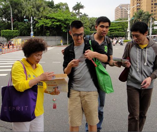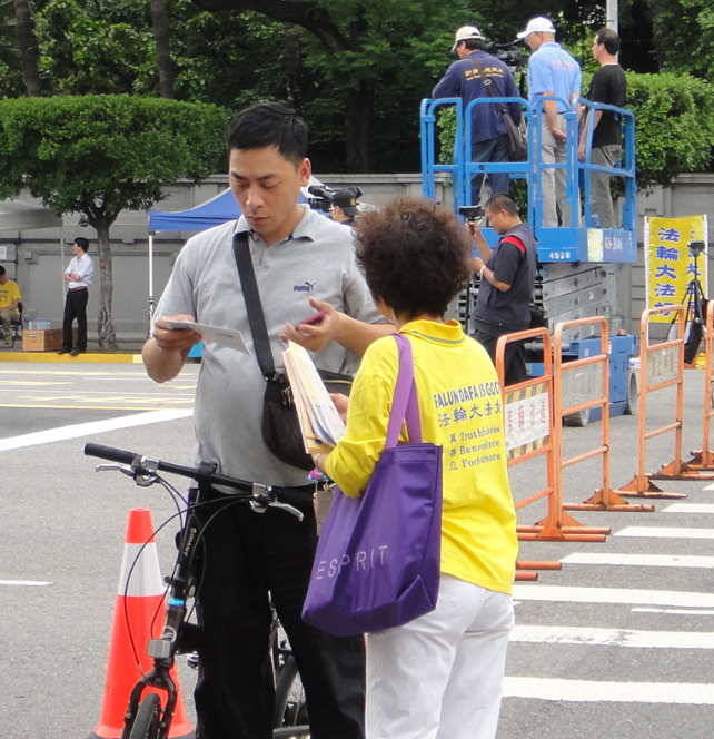 一位要去附近台大医院探望父亲的中年男子,刻意将车子停在活动场所外围拍照,他表示:“法轮功这功法很赞!”他在电视或住家附近炼功点看到法轮功遭受迫害与被活摘器官等讯息。他很支持法轮功学员在景点或类似今天的讲真相活动。他希望让更多大陆游客知道真相。最后,他以“祝福你们”向法轮功学员表示敬意。