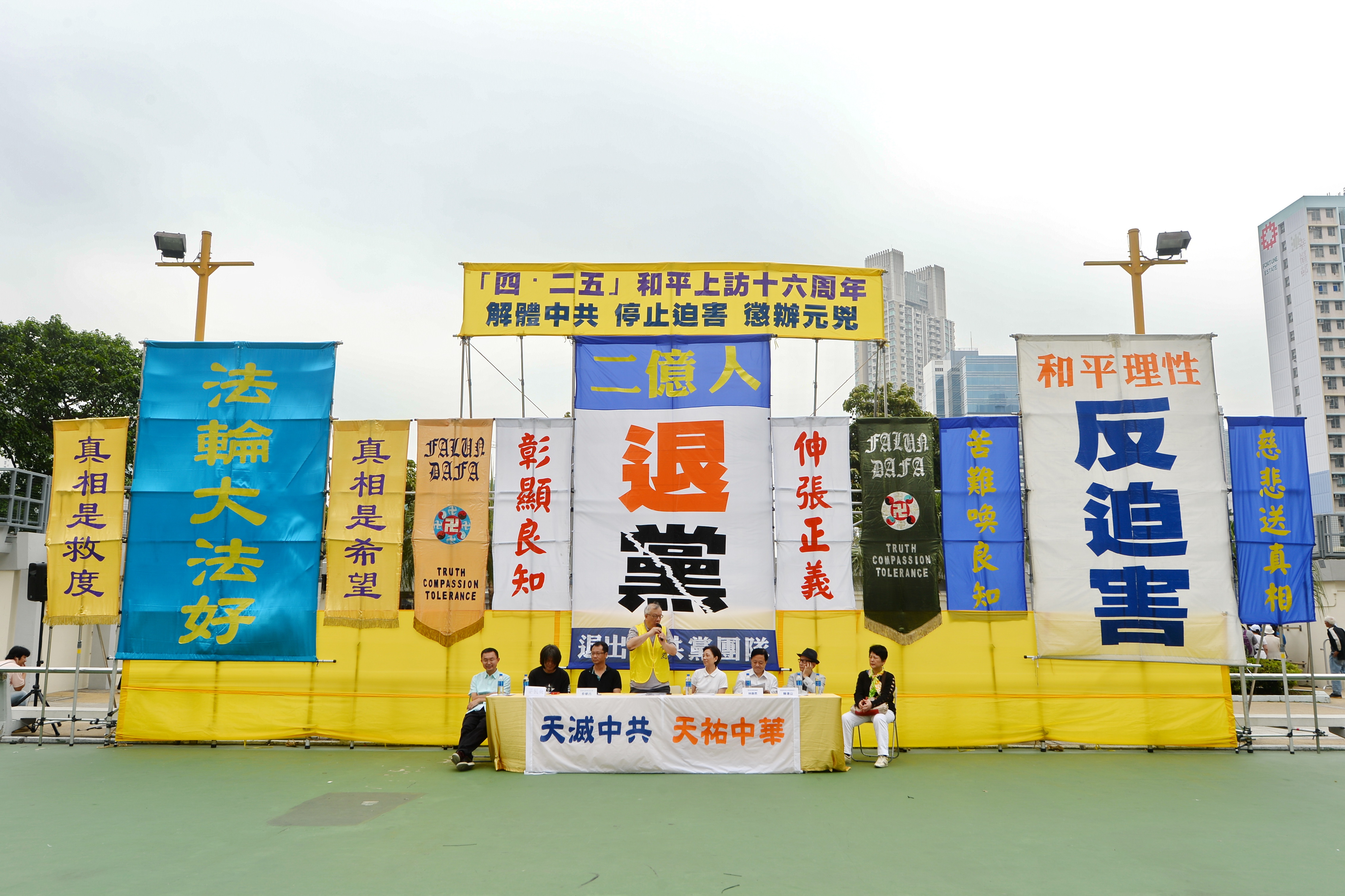 香港法轮佛学会发言人简鸿章在集会上表示,十六年前,逾万名法轮功学员自发到北京中南海国务院信访办和平上访,表现出和平理性的精神受到国际社会高度评价。十六年来,更证实中共迫害真、善、忍把自己迫害倒了。随着周永康、薄熙来等人相继落马,迫害法轮功的江泽民流氓集团元凶主犯必将被送上历史的大审判台,他呼吁大陆民众快退出共产党,简鸿章说:“在这个历史巨变的关键时刻,只有了解真相,守住善念良知,才能得到上天的护佑,迈向光明的未来。二亿人已经走在前头,您也一定要跟上来!”