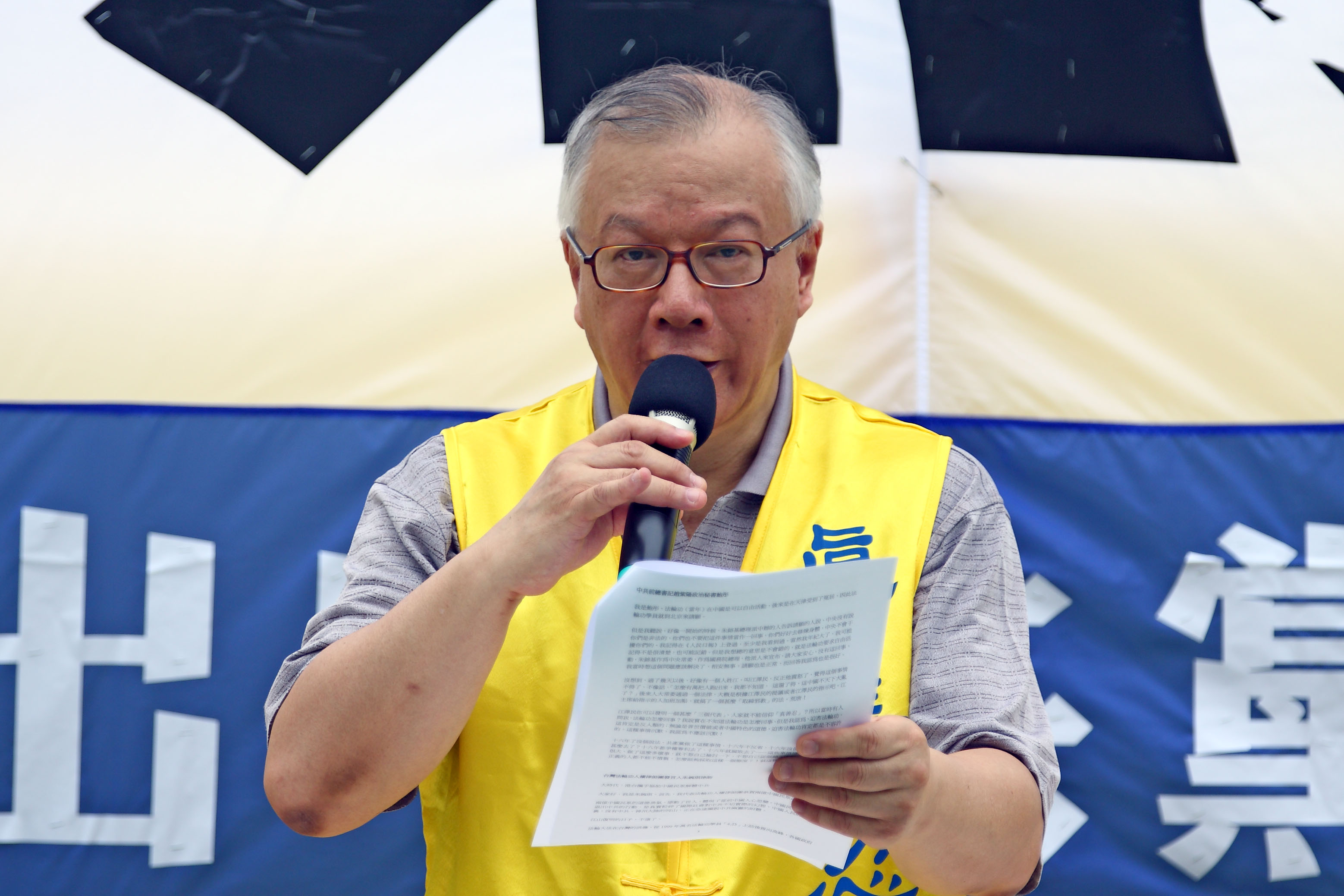 ![]() 香港法轮佛学会发言人简鸿章在集会上呼吁中国民众快快跟上退党大潮。 |