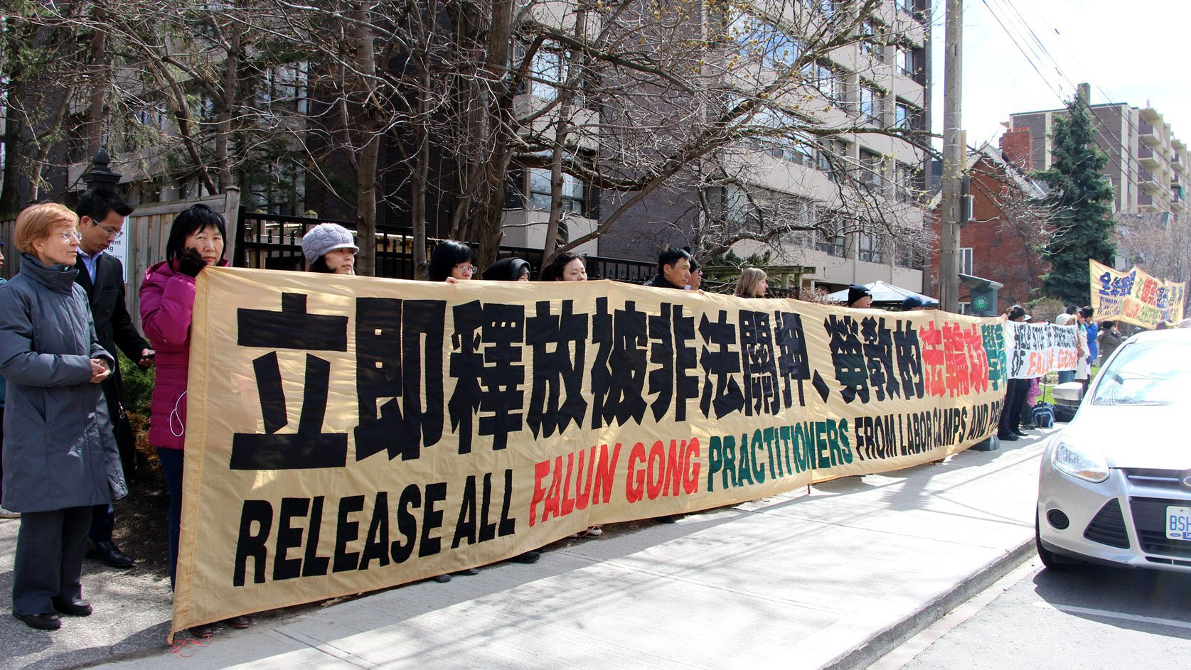 ![]() 图1-3:二零一五年四月二十四日,多伦多法轮功学员在中领馆前召开新闻发布会,纪念四•二五和平请愿壮举并揭露中共谎言和迫害。 |