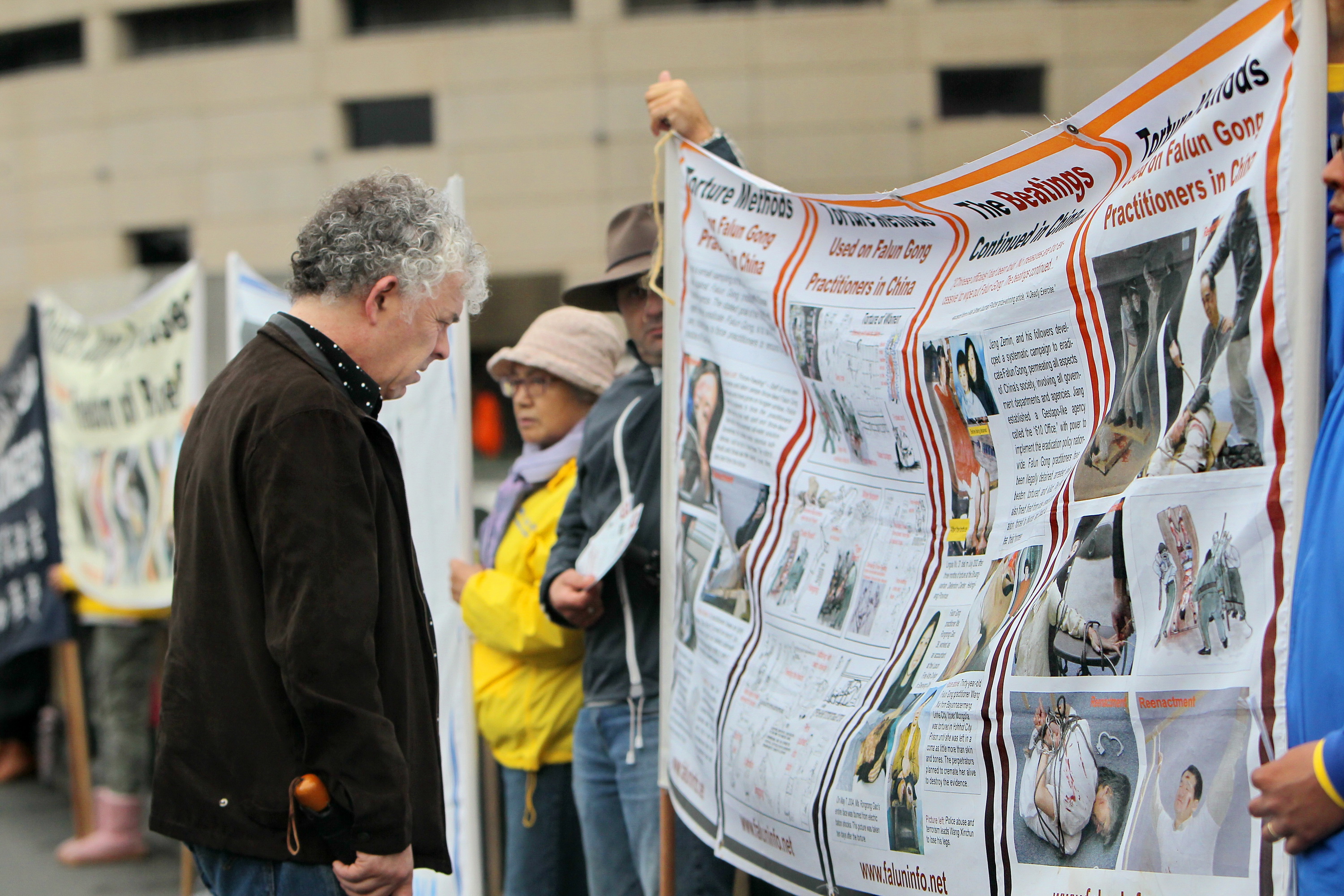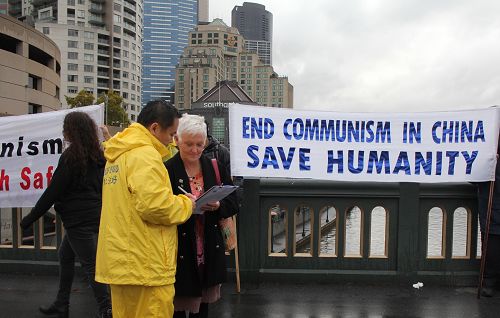 一位华人老太太乘坐电车经过王子桥,看到法轮功学员的“勇气长城”后,立即下车,慢慢走过所有横幅。她和在征签的法轮功学员田女士谈了许久,她告诉田女士:“我还没有到目的地,但看到你们,我就下来了,这是我支持你们的方式。现在很多中国人都不关心这个事情,令人悲哀。”