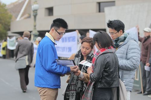 当天适逢澳洲的公共假日——澳纽军团日,缅怀纪念在历次战事中为保卫祖国、维护和平而捐躯的澳洲英雄们。上午一年一度的大游行之后,王子桥畔依然熙熙攘攘,墨尔本法轮功学员的活动引起了许多市民和游人的关注,许多路人停下脚步倾听学员们讲述真相,并签名呼吁停止迫害。三个小时之内,超过七百人在征签表上签了名。